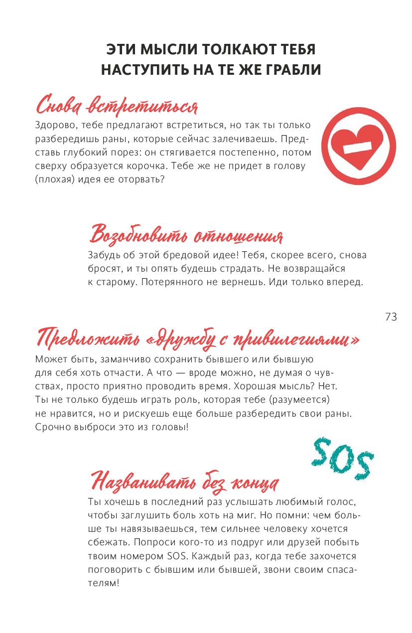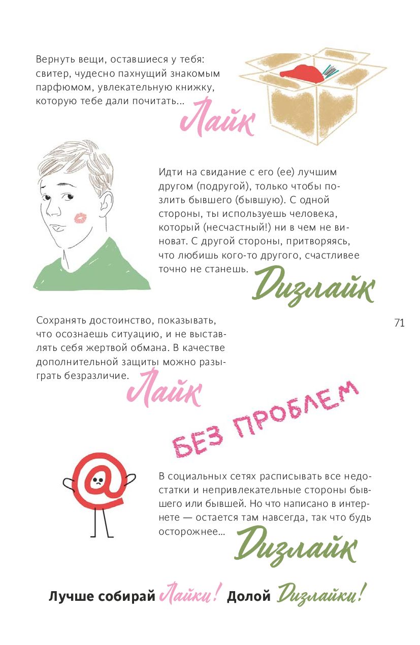 Авторы этой книги бережно и не преуменьшая серьезности происходящего помогают подростку пережить его первую драму. Красивые иллюстрации, анкеты и тесты, вопросы для размышления, списки книг и фильмов, – все это поможет выбраться из уныния и извлечь положительный опыт из отношений, которые закончились.