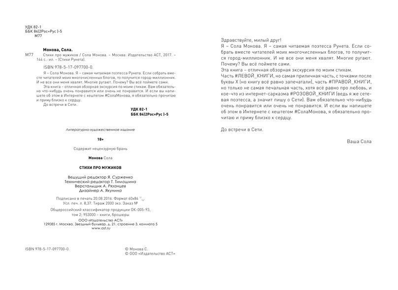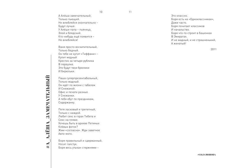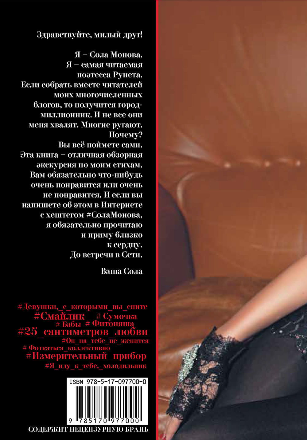 Эта книга – отличная обзорная экскурсия по моим стихам. Вам обязательно что-нибудь очень понравится или очень не понравится. И если вы напишете об этом в Интернете с хештегом #СолаМонова, я обязательно прочитаю и приму близко к сердцу.