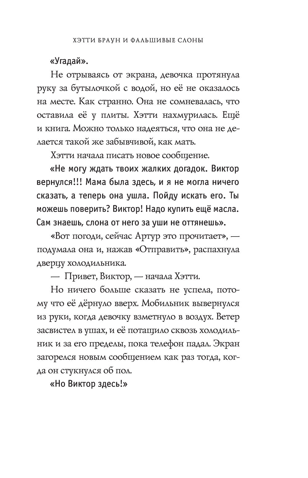 Однажды Хэтти Браун открыла холодильник, не ожидая найти в нём что-нибудь новенькое, и увидела... слона. Крохотного слона из другого мира. Это её друг Виктор, и он снова забрал девочку в свой причудливый мир. Но там Хэтти встретила ещё одного слона, который сказал, что это он – настоящий Виктор. А потом появились ещё и ещё слоны и каждый твердил, что он Виктор. Хэтти запуталась. Она не понимает, зачем фальшивый Виктор затащил её в свой мир, почему этих Викторов столько, кому из них можно верить и как ей вернуться домой из этого мира абсурда без особых приключений? Но из другого мира без приключений ещё никто не уходил...