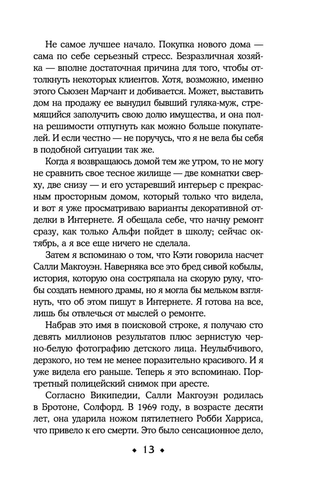 Кто же она, эта волчица в овечьей шкуре? Как ее узнать, если фотографий Салли Макгоуэн нет? Возможно, это эксцентричная художница? Или странноватая владелица магазинчика эзотерических товаров? Или холодно-отстраненная хозяйка дома, который недавно смотрела риелтор Джоанна Критчли, переехавшая в городок из Лондона с сынишкой Альфи?