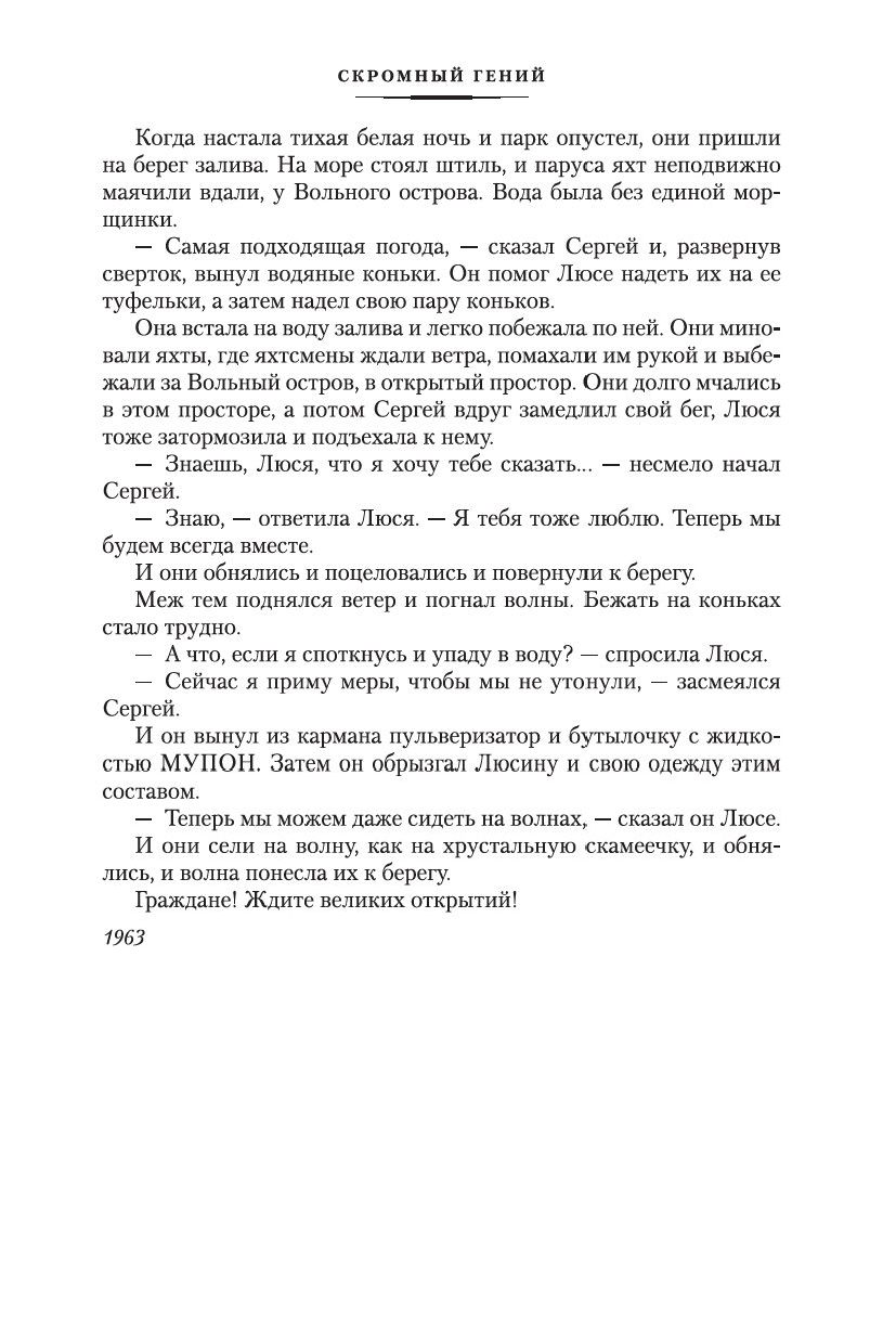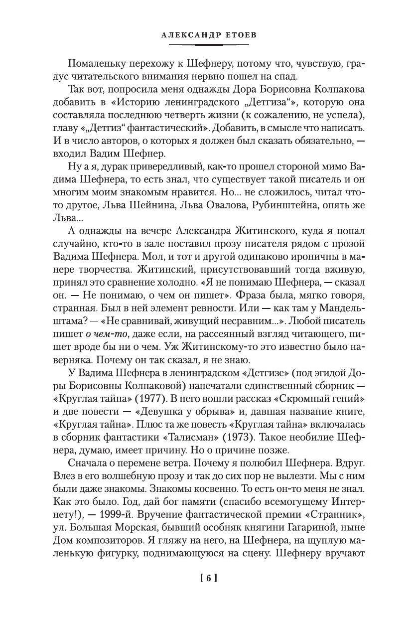 Принцип обыкновенного чуда – основа шефнеровского письма (не зря же Шефнер и Шварц начинаются на одну букву). И – простота его скромных гениев, не очень-то задумывающихся над тем, какое чудо они придумали (для них ведь это дело житейское); главное, чтобы это чудо хоть кому-то принесло радость. И – "сложность" других его персонажей, тех, что делают чудеса практические: четырехгранные велосипедные спицы, мыло под названием "Не воруй", заполненное изнутри черной жидкостью, метящей похитителя. И... Многие эти "И" – и составляют суть удивительного явления по имени Вадим Шефнер.