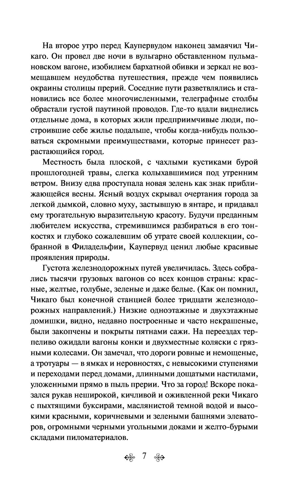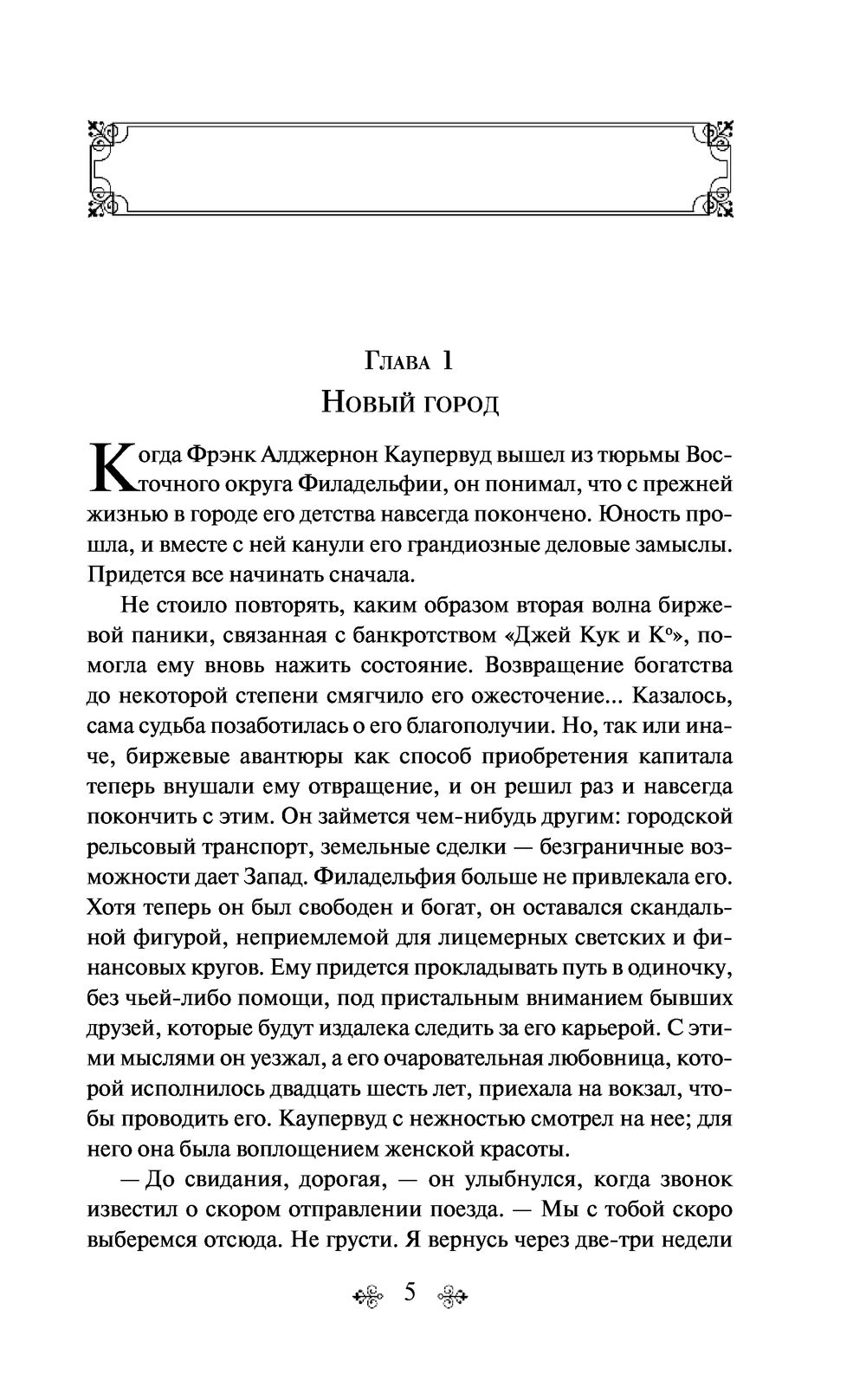 Вторая часть знаменитой "Трилогии желания" о финансисте Фрэнке Каупервуде, начавшем все сначала после филадельфийской тюрьмы. Бурлящий Чикаго – и большой бизнес, политика, любовь – все подчиняется воле главного героя.