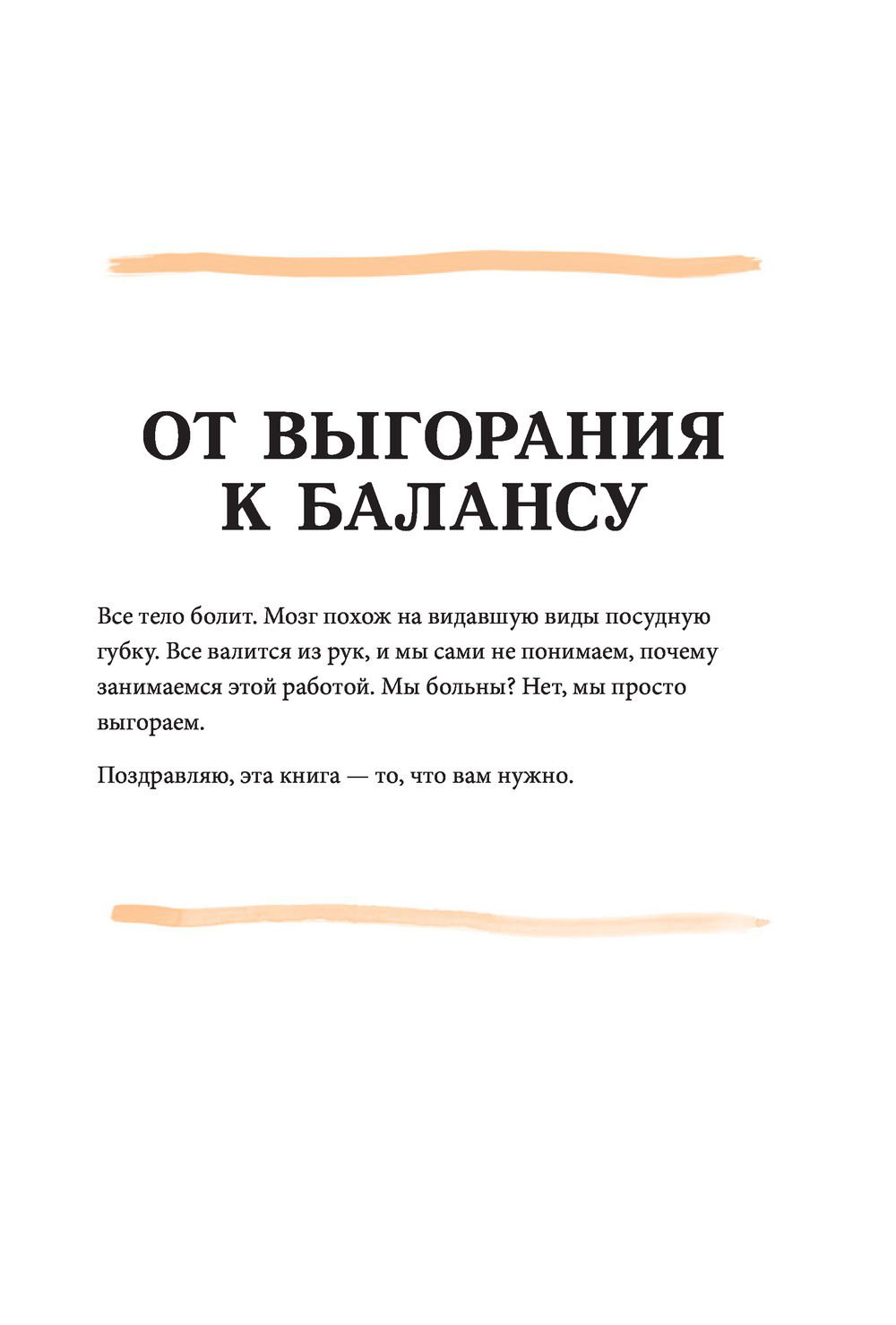 Книга разделена на три части. Первая расскажет, что делать в острой стадии выгорания, когда помощь нужна незамедлительно. Вторая – как помочь себе, если наваливаются кратковременные проблемы, например, вы переживаете неудачу или вынуждены общаться с неприятным человеком. Третья – что делать с затяжными проблемами: если чувствуете, что запутались, вымотались и утратили ориентиры.