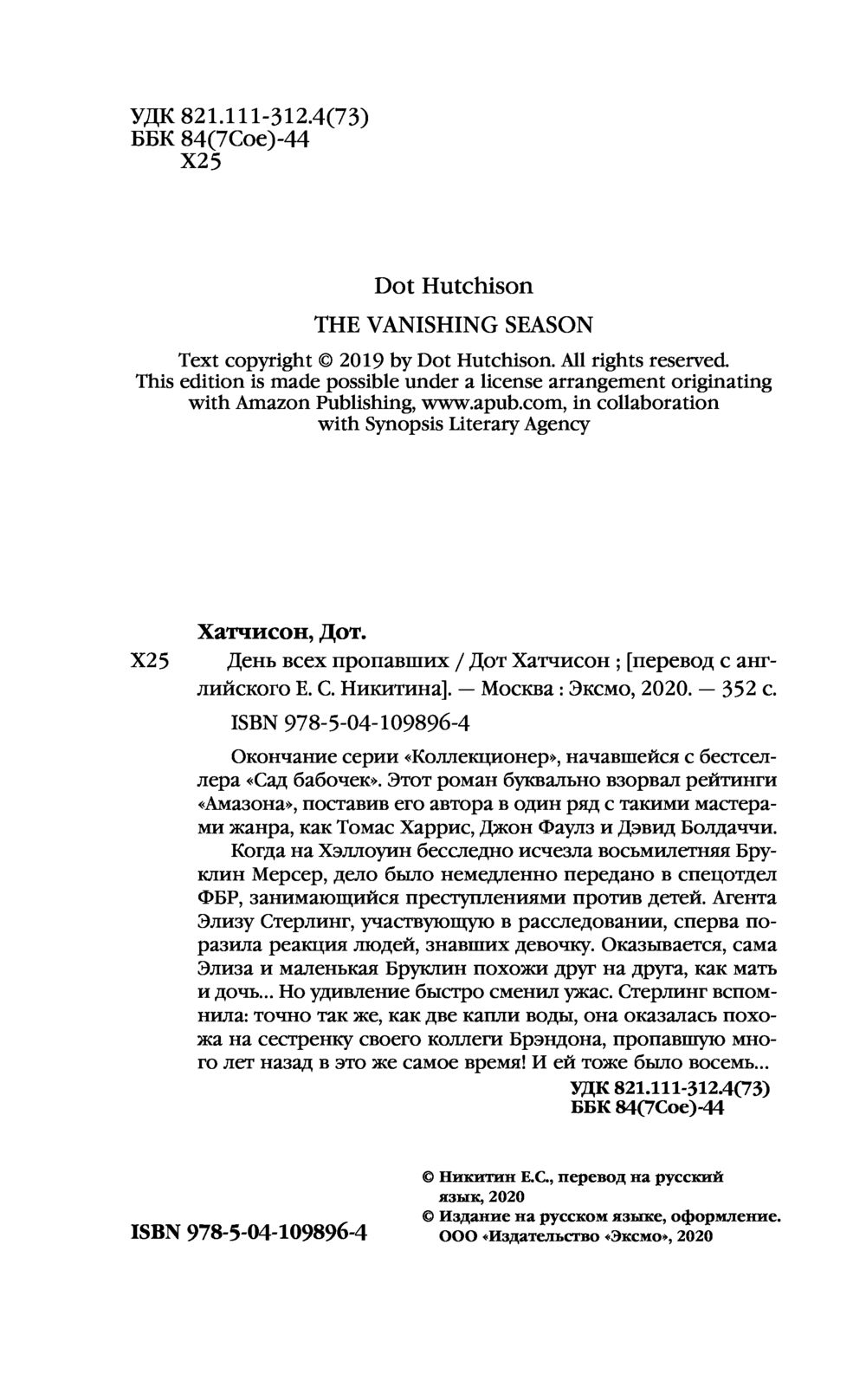 Окончание серии "Коллекционер", начавшейся с бестселлера "Сад бабочек". Этот роман буквально взорвал рейтинги "Амазона", поставив его автора в один ряд с такими мастерами жанра, как Томас Харрис, Джон Фаулз и Дэвид Болдаччи. Когда на Хэллоуин бесследно исчезла восьмилетняя Бруклин Мерсер, дело было немедленно передано в спецотдел ФБР, занимающийся преступлениями против детей. Агента Элизу Стерлинг, участвующую в расследовании, сперва поразила реакция людей, знавших девочку. Оказывается, сама Элиза и маленькая Бруклин похожи друг на друга, как мать и дочь... Но удивление быстро сменил ужас. Стерлинг вспомнила: точно так же, как две капли воды, она оказалась похожа на сестренку своего коллеги Брэндона, пропавшую много лет назад в это же самое время! И ей тоже было восемь...