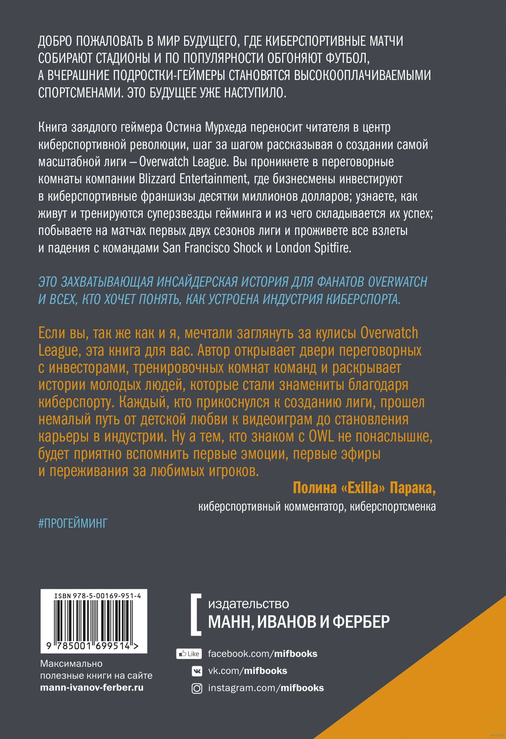 Автор книги Остин Мурхед – заядлый любитель компьютерных игр, чье внимание приковала к себе лига по Overwatch (OWL): не случайно спортивные магнаты Роберт Крафт, Стэн Кронке и Джефф Уилпон выложили по 20 миллионов долларов, чтобы их команды приняли в ней участие. Пока автор изучает жизнь лиги, OWL у нас на глазах делает киберспорт одним из популярнейших развлечений американской аудитории, заключая контракты на телевизионное вещание с ABC и ESPN, полностью заполняя стадионы НБА во время своих матчей и параллельно формируя новый типаж юных профессиональных спортсменов.