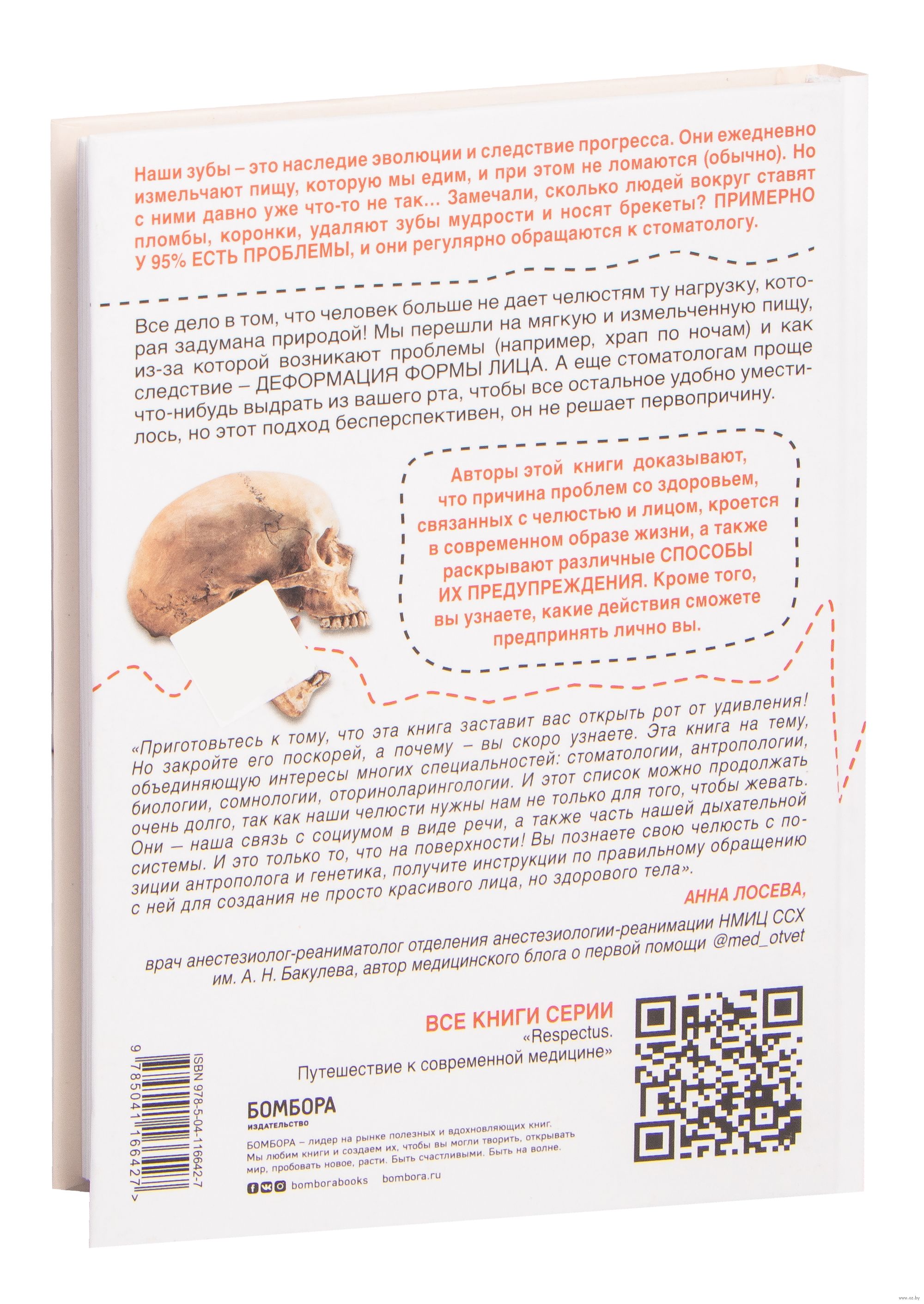 Огромное количество детей и взрослых по всему миру имеют проблемы с прикусом, и эти проблемы носят не только эстетический характер, они могут стать причиной серьезных заболеваний. В своей книге врач-стоматолог и доктор медицинских наук, Сандра Кан, и Пол Р. Эрлих, известный биолог и специалист в области демографических исследований, изучают причины и последствия неправильного развития челюсти у современного человека, а также представляют новый взгляд на ортодонтию, профилактику и лечение зубов. По их мнению, из-за недостаточного развития челюсти могут возникать апноэ, затруднение дыхания, болезни сердца, депрессия и других опасные состояния. Они делятся своим новаторским подходом и предлагают простые корректировки (например, переход к более жесткой пище), которые помогут с самого раннего возраста правильно формировать и развивать челюсть, чтобы в будущем у ребенка было крепкое здоровье. Авторы предлагают задуматься и обратить внимание на то, как вы дышите, жуете, спите, чтобы выработать более здоровые привычки и сделать свою жизнь лучше.