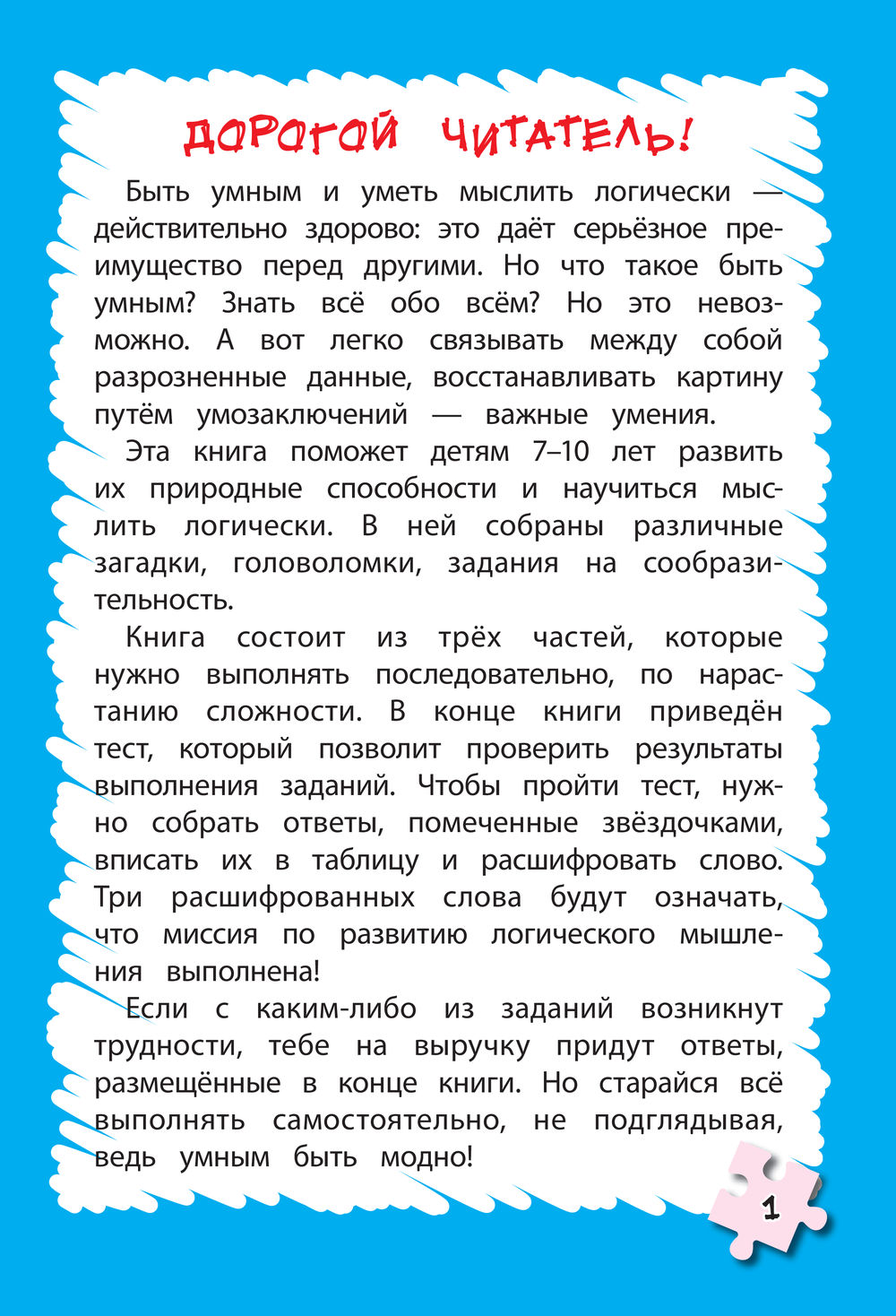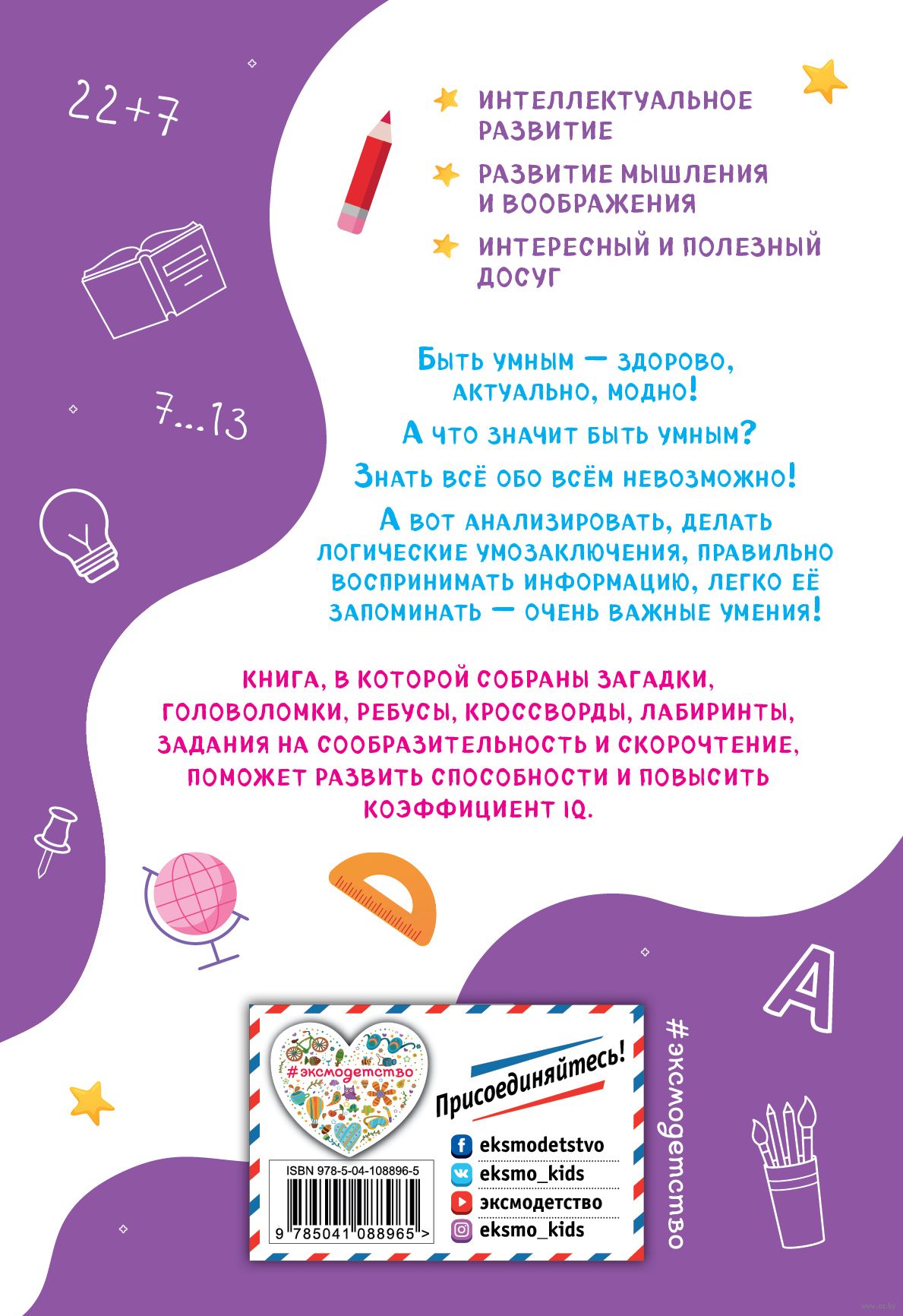 В книге представлены занимательные упражнения по русскому языку и математике, лабиринты, кроссворды, анаграммы, математические пирамиды и цепочки, шифры и коды, ребусы, викторины и игры, которые помогут развитию логического мышления ребёнка. Каждая страница включает одно-два задания, представленные в игровой форме, они разбиты по сложности на три раздела. В конце книги имеются ответы, которыми можно воспользоваться в случае необходимости.