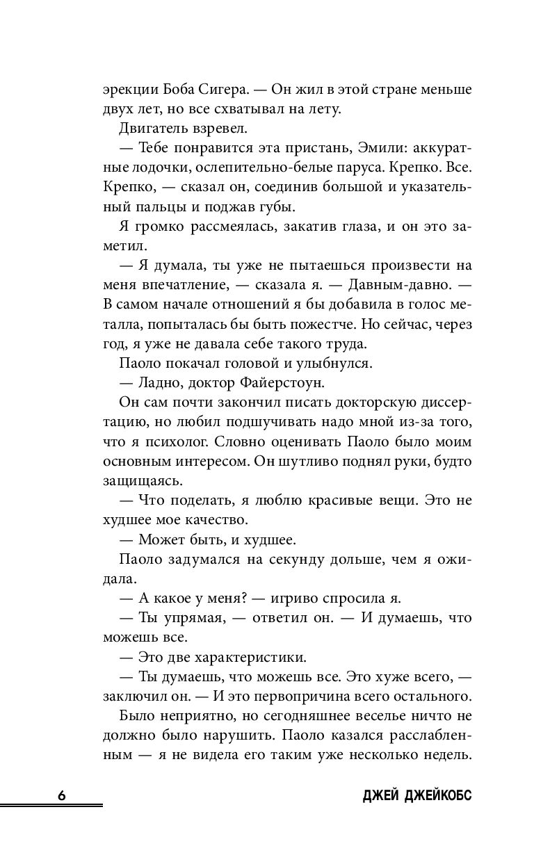 Когда он предлагает устроить небольшое морское путешествие на выходных, Эмили соглашается: вино, вода и любимый мужчина – что может быть лучше? На следующее утро после отплытия Эмили просыпается – лодка все еще плывет по течению. А Паоло вдруг не стало. Он не мог утонуть. С каждой минутой Эмили становится все сложнее сохранять рассудок и оставаться на плаву. Куда исчез Паоло?