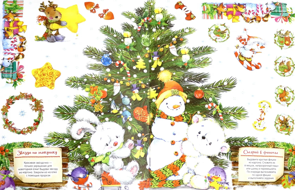 Чтобы собрать и украсить НАСТОЯЩУЮ НОВОГОДНЮЮ ЁЛКУ, малышу больше не понадобятся ни клей, ни ножницы. Все детали прорезаны по контуру, легко выдавливаются и складываются, фигурки Деда Мороза, Снегурочки и забавных зверюшек можно расставить возле ёлочки и играть с ними.