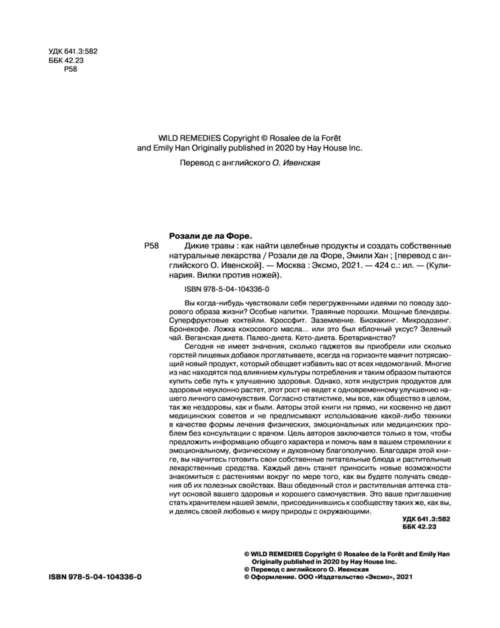 Сегодня не имеет значения, сколько гаджетов вы приобрели или сколько горстей пищевых добавок проглатываете, всегда на горизонте маячит потрясающий новый продукт, который обещает избавить вас от всех недомоганий. Многие из нас находятся под влиянием культуры потребления и таким образом пытаются купить себе путь к улучшению здоровья. Однако, хотя индустрия продуктов для здоровья неуклонно растет, этот рост не ведет к одновременному улучшению нашего личного самочувствия. Согласно статистике, мы все, как общество в целом, так же нездоровы, как и были. Авторы этой книги ни прямо, ни косвенно не дают медицинских советов и не предписывают использование какой-либо техники в качестве формы лечения физических, эмоциональных или медицинских проблем без консультации с врачом. Цель авторов заключается только в том, чтобы предложить информацию общего характера и помочь вам в вашем стремлении к эмоциональному, физическому и духовному благополучию. Благодаря этой книге, вы научитесь готовить свои собственные питательные блюда и растительные лекарственные средства. Каждый день станет приносить новые возможности знакомиться с растениями вокруг по мере того, как вы будете получать сведения об их полезных свойствах. Ваш обеденный стол и растительная аптечка станут основой вашего здоровья и хорошего самочувствия. Это ваше приглашение стать хранителем нашей земли, присоединившись к сообществу таких же, как вы, и делясь своей любовью к миру природы с окружающими.