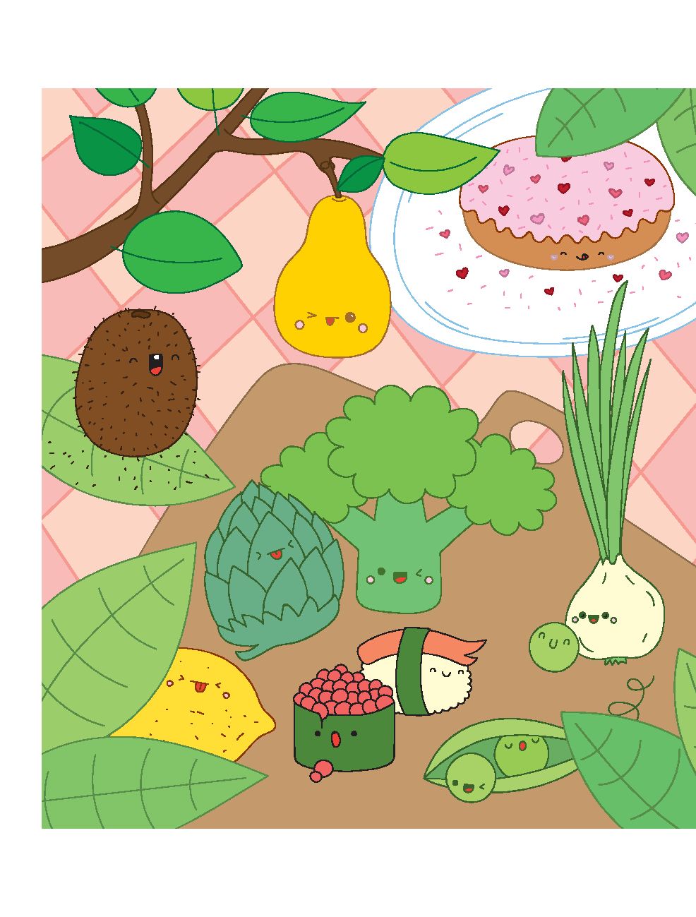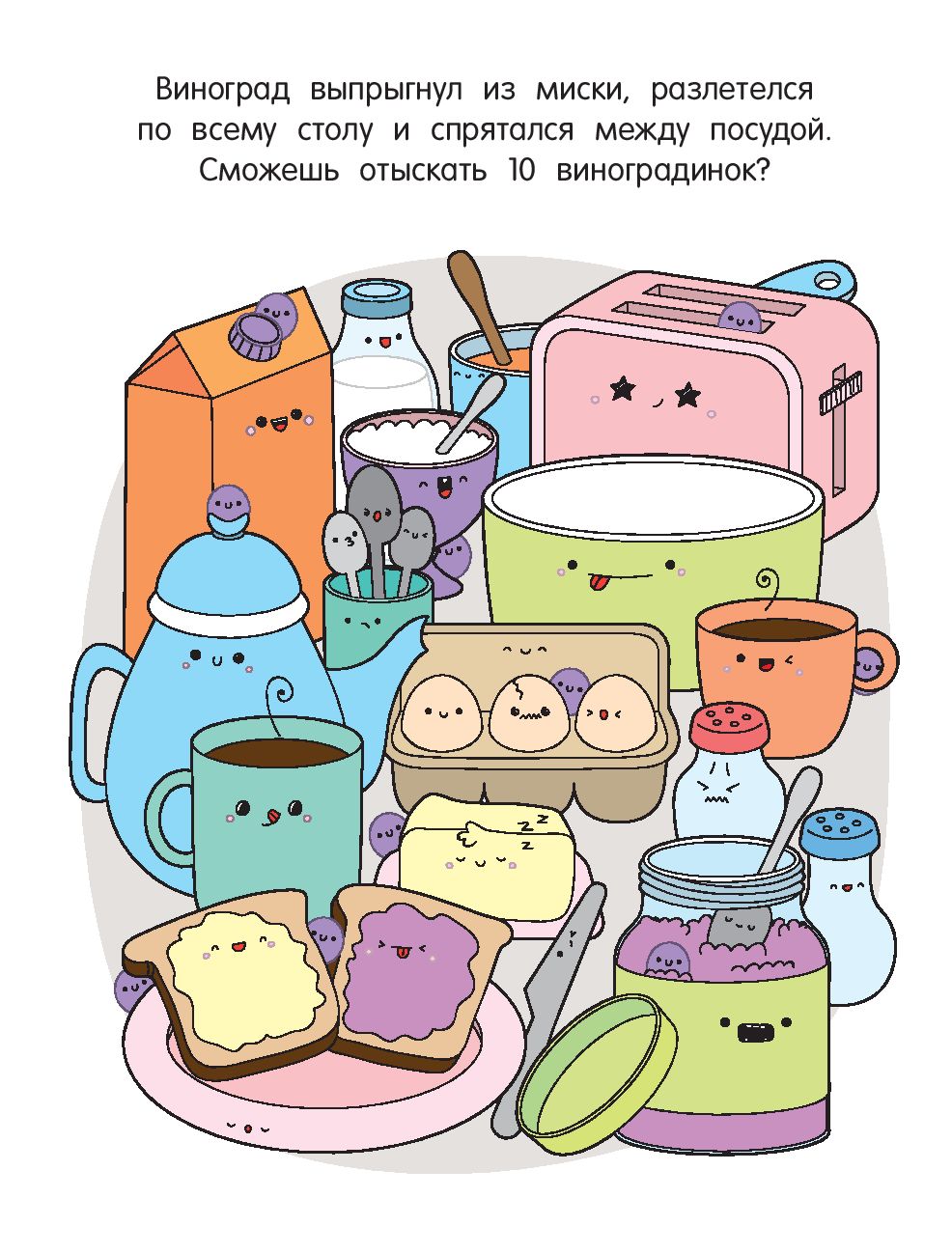 Вы когда-нибудь рисовали причёску для морковки? Придумывали собственный дизайн конфет? В этой книжке собрано множество популярных головоломок, заданий, лабиринтов, которые нарисованы так мило, что от них просто невозможно оторваться! Просто представьте, как весело считать улыбающиеся вишенки или создавать свой суп из овощей с удивительно кавайными мордашками! А поющий сельдерей и очаровательная брокколи – отличный повод поговорить о важности полезного питания. Играть с едой в этой книжке только поощряется. Поверьте, фрукты и овощи никогда ещё не были такими славными!