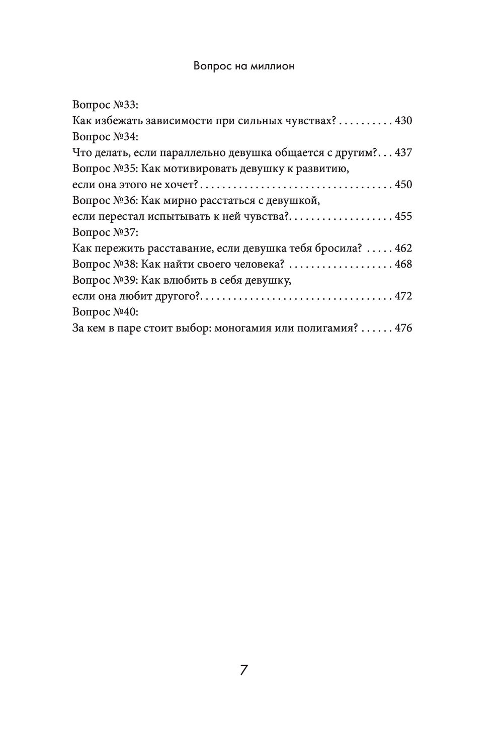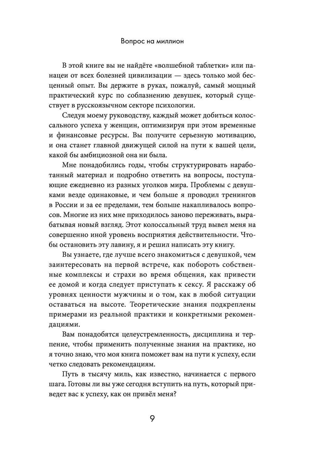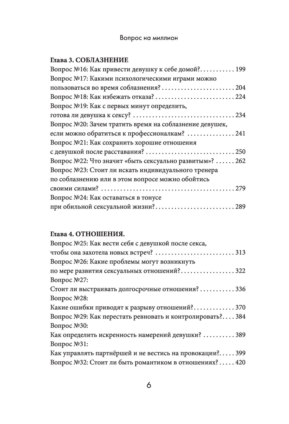 Книга "Вопрос на миллион" явилась результатом более чем 10-летней работы автора как психолога и сексолога. В сорока вопросах систематизирована практика, включающая не только соблазнение, но и удержание отношений с девушками, и правила бесконфликтного расставания с ними.