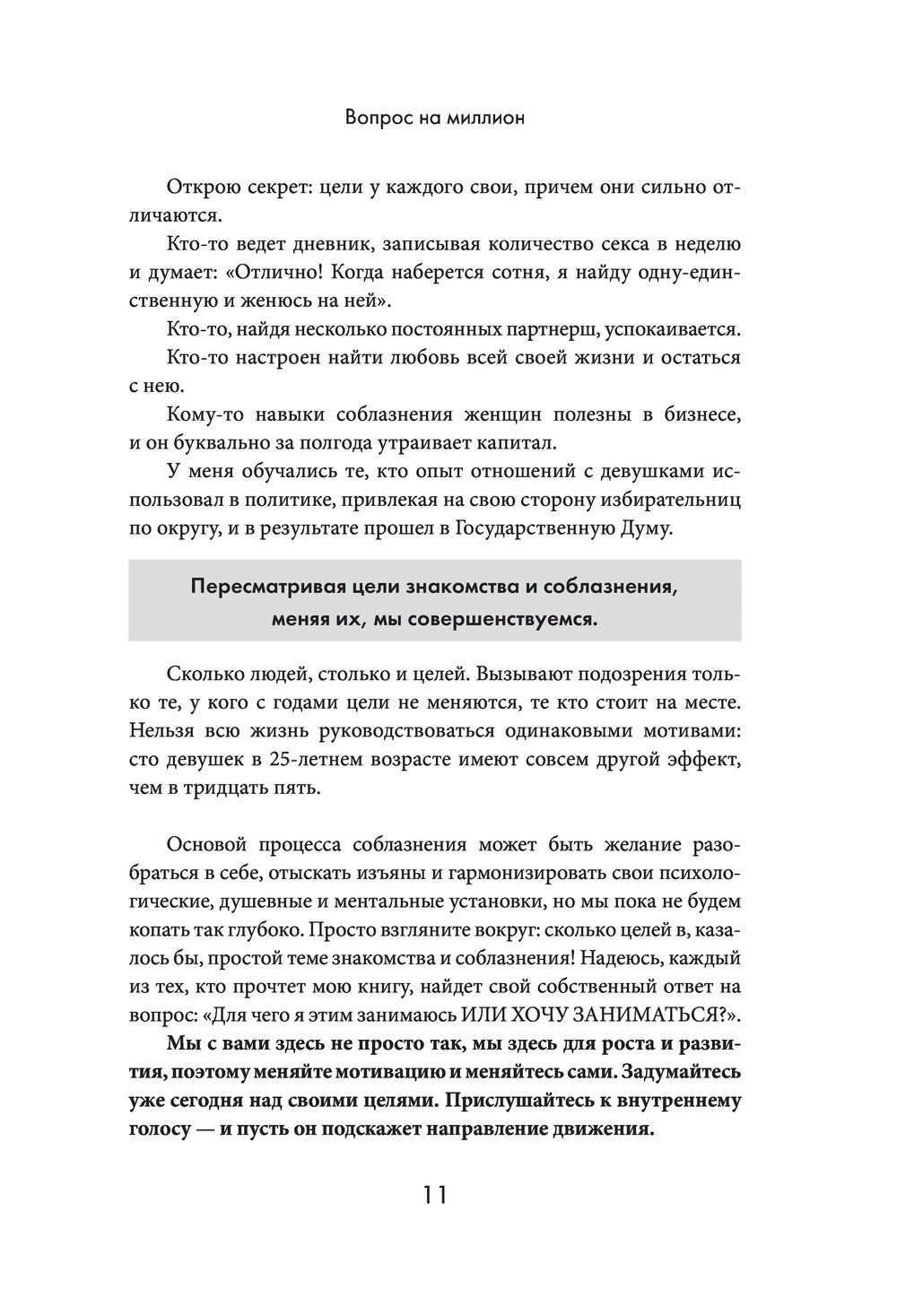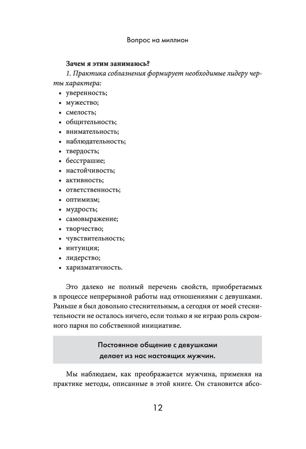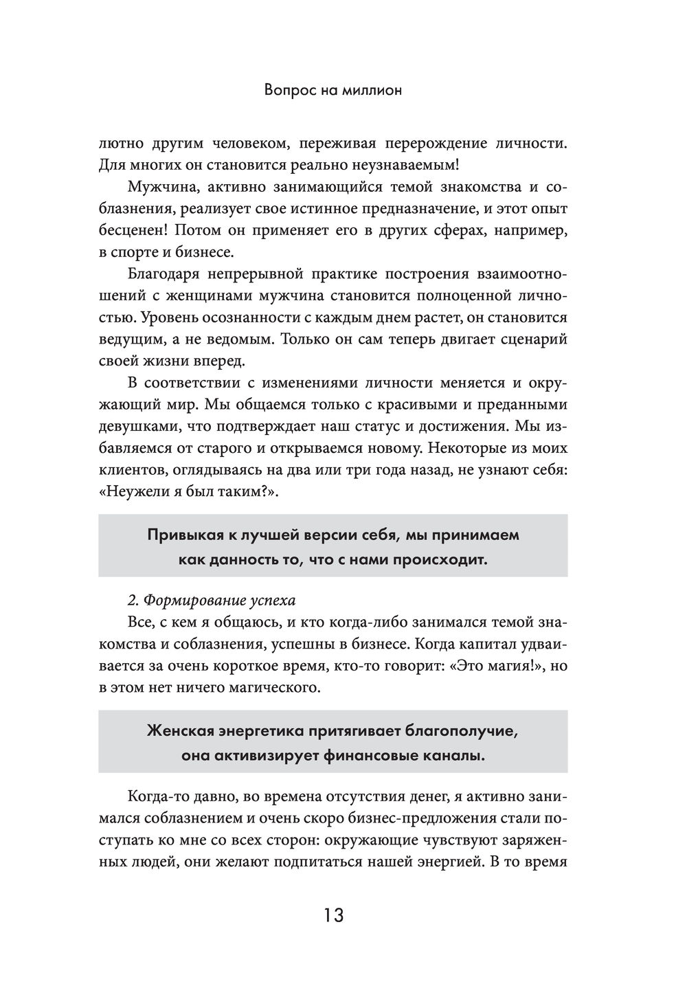 Книга "Вопрос на миллион" явилась результатом более чем 10-летней работы автора как психолога и сексолога. В сорока вопросах систематизирована практика, включающая не только соблазнение, но и удержание отношений с девушками, и правила бесконфликтного расставания с ними.