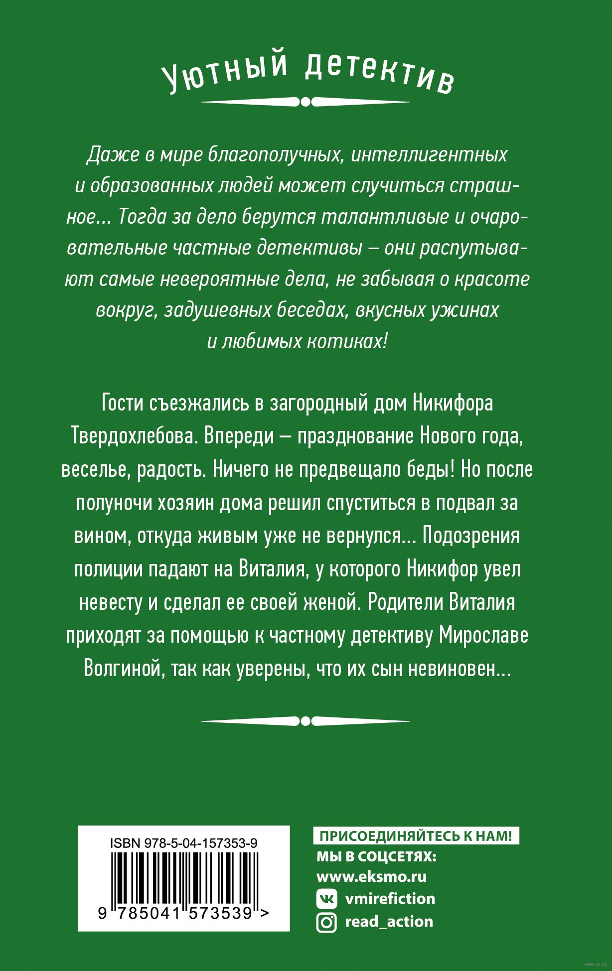 Гости съезжались в загородный дом Никифора Твердохлебова. Впереди – празднование Нового года, веселье, радость. Ничего не предвещало беды! Но после полуночи хозяин дома решил спуститься в подвал за вином, откуда живым уже не вернулся... Подозрения полиции падают на Виталия, у которого Никифор увел невесту и сделал ее своей женой. Родители Виталия приходят за помощью к частному детективу Мирославе Волгиной, так как уверены, что их сын невиновен...
