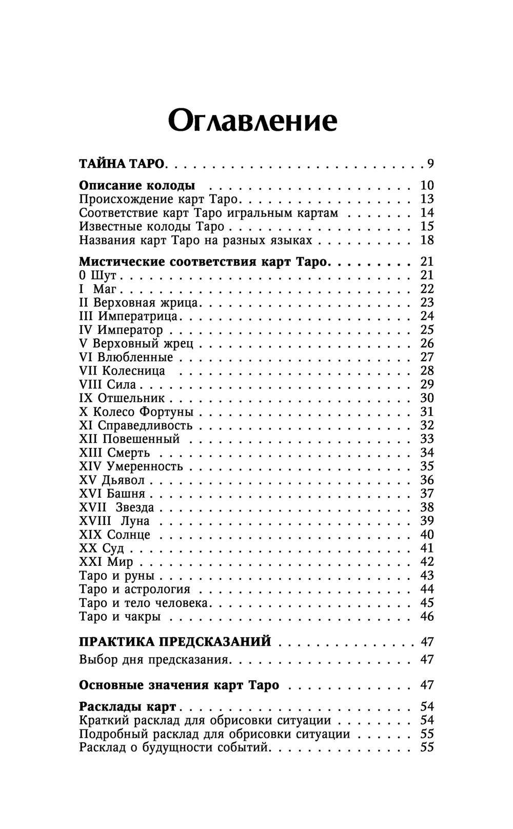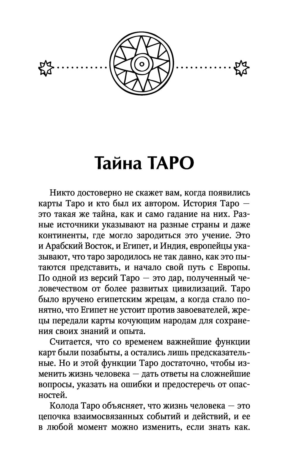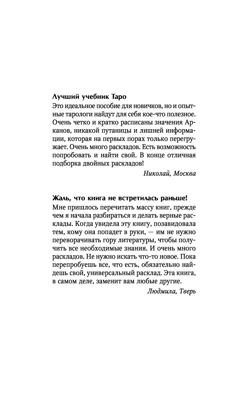 Это настоящий путеводитель по миру Таро. Вы найдете здесь одну из самых полных коллекций раскладов на все случаи жизни и подробное их толкование. В книге нет "воды", а только все самое важное и необходимое, чтобы начать гадать на картах Таро.