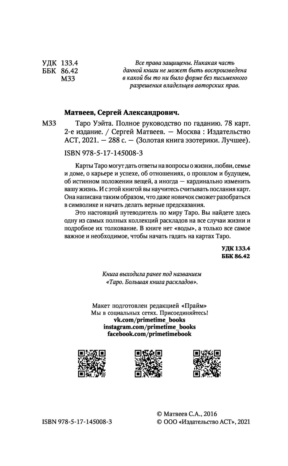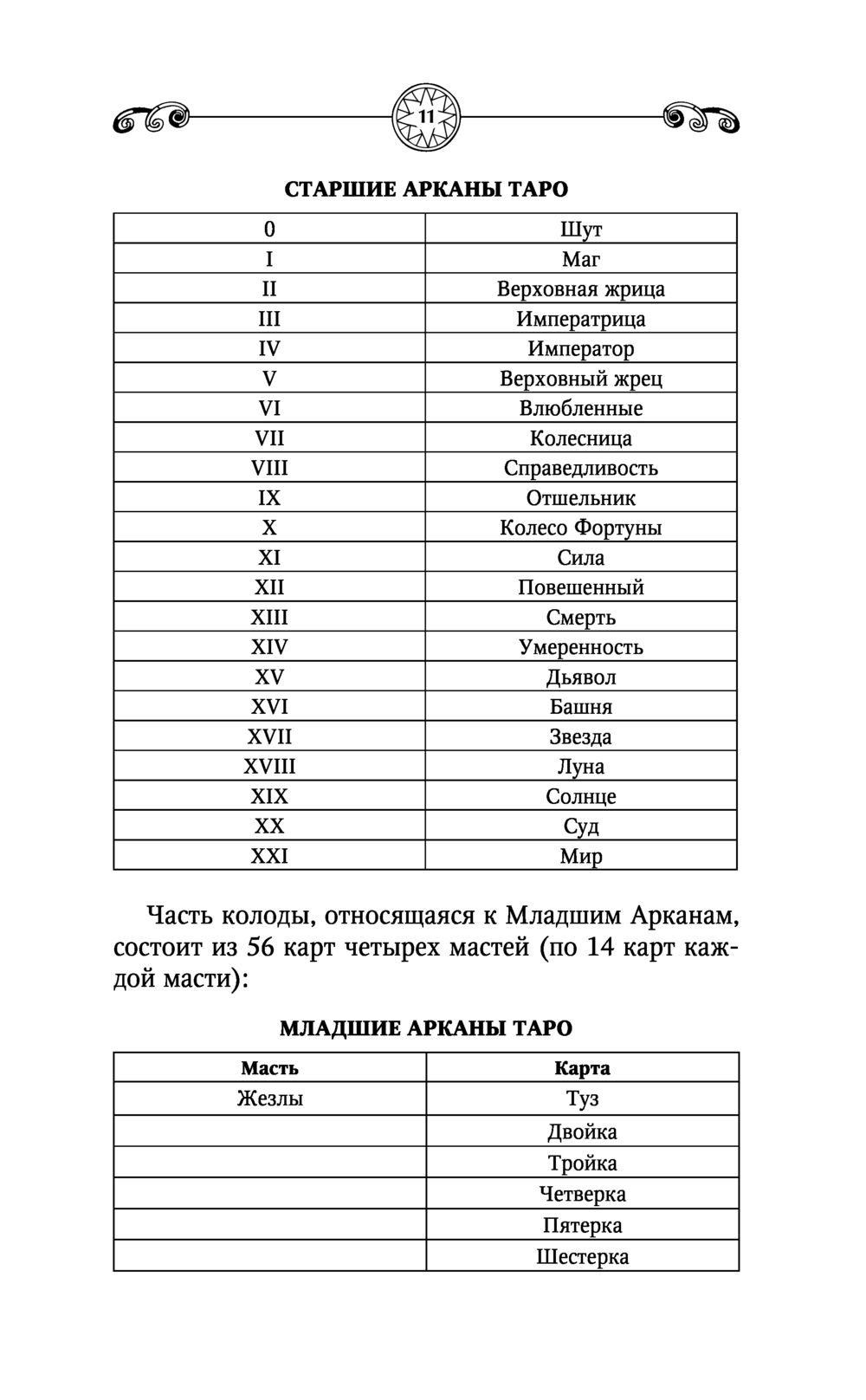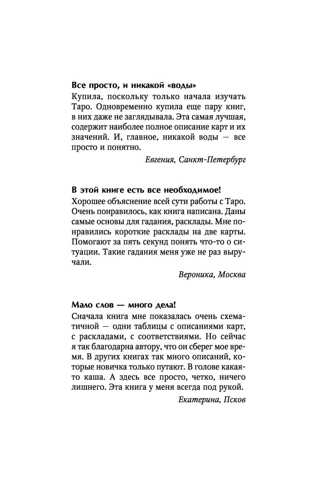 Это настоящий путеводитель по миру Таро. Вы найдете здесь одну из самых полных коллекций раскладов на все случаи жизни и подробное их толкование. В книге нет "воды", а только все самое важное и необходимое, чтобы начать гадать на картах Таро.
