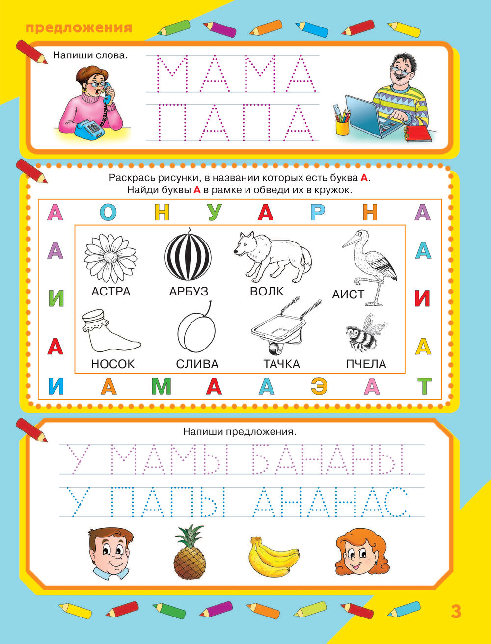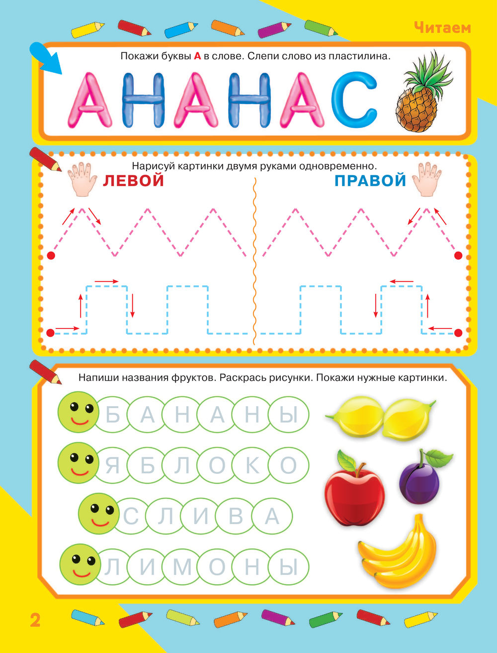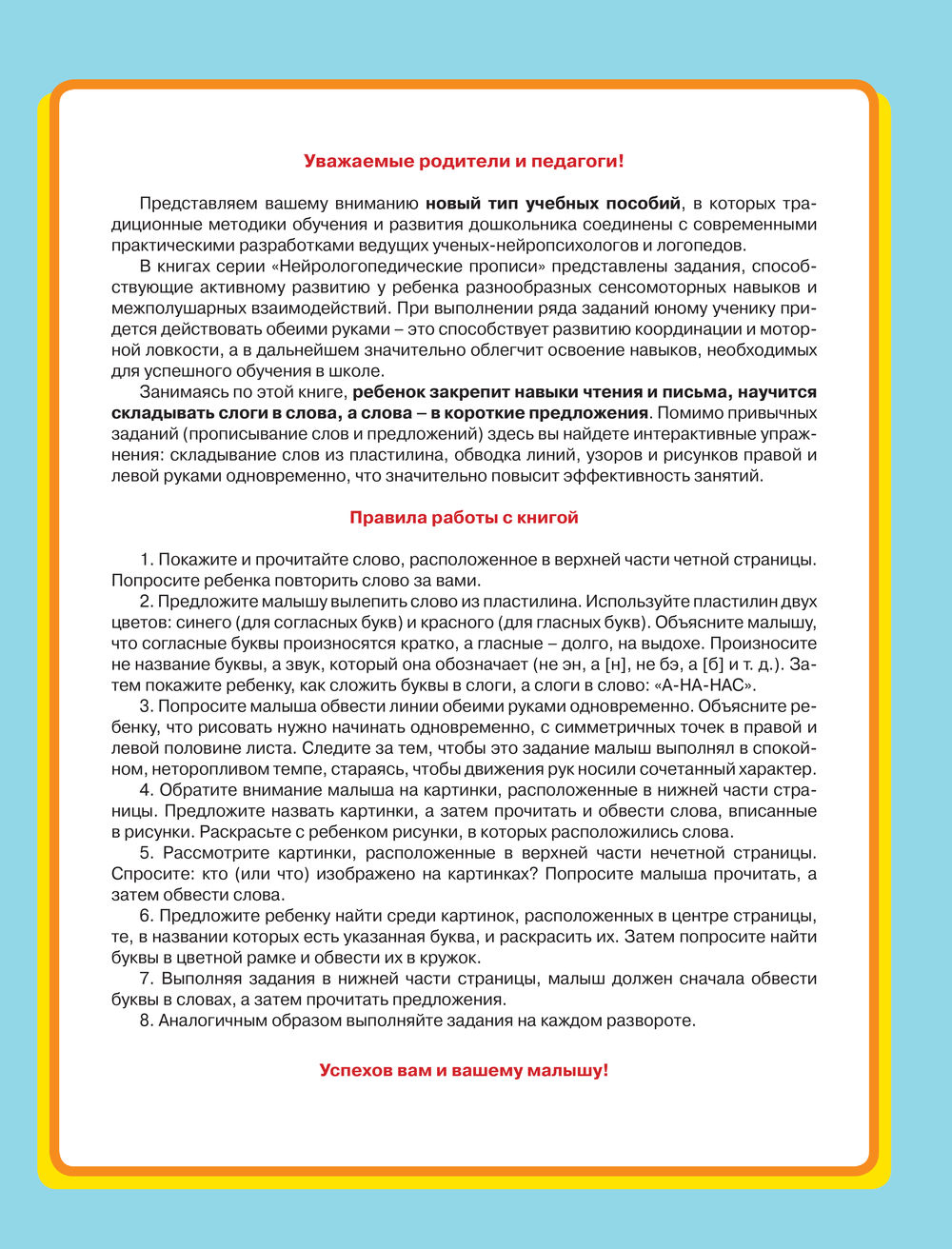 Занимаясь по этой книге, ребенок закрепит навыки чтения и письма, научится складывать слоги в слова, а слова в короткие предложения. Помимо привычных заданий (прописывание слов и предложений), здесь вы найдете интерактивные упражнения: складывание слов из пластилина, обводка линий, узоров и рисунков правой и левой руками одновременно, что значительно повысит эффективность занятий.