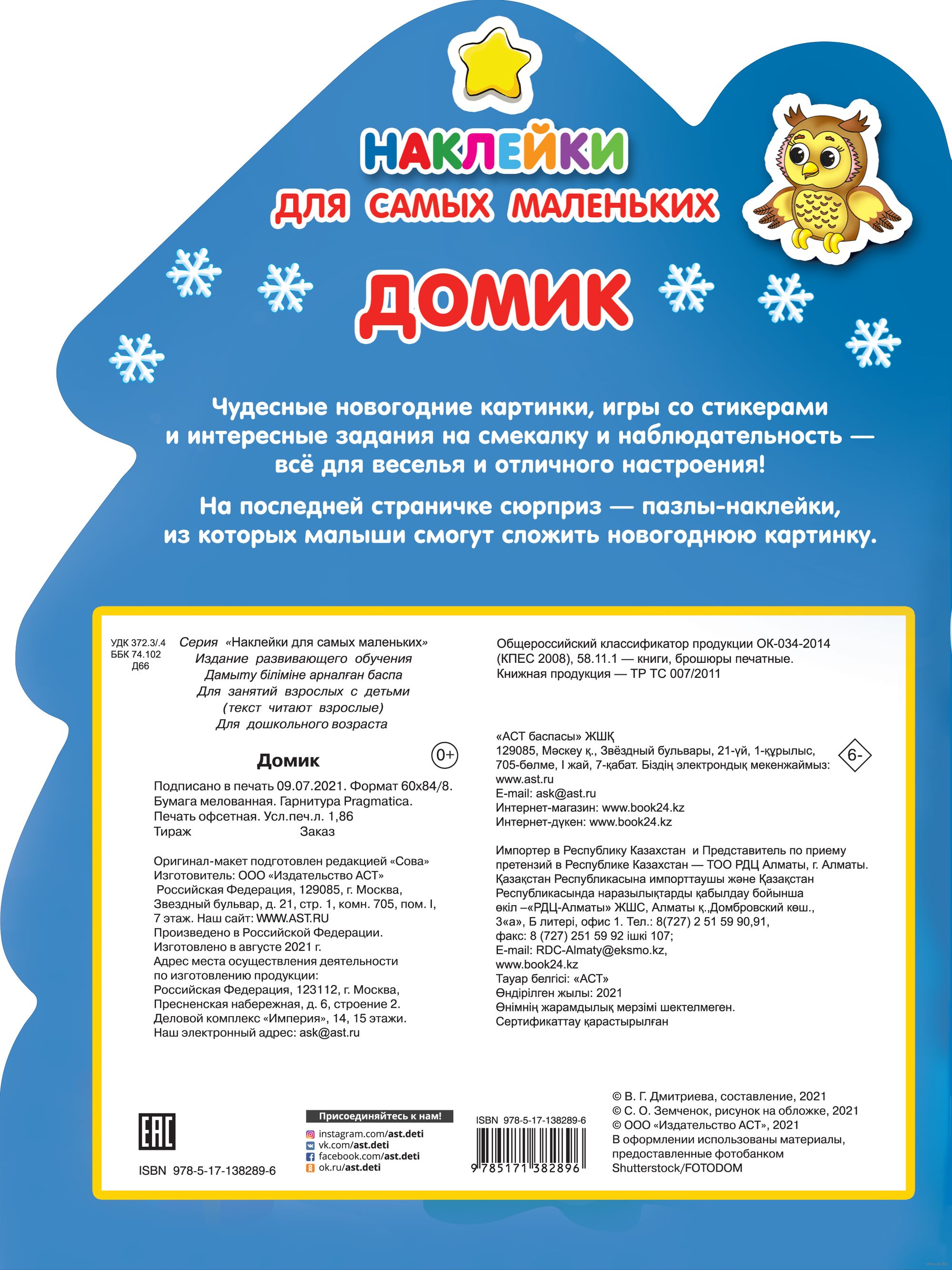 "Домик" – замечательная цветная книжка с фигурной вырубкой в виде домика. Это красочные иллюстрации + развивающие задания + коллекция красочных новогодних стикеров. На страницах книжки малыши помогут зверятам украсить дом к празднику, всех ждут новогодние чудеса! А на последней странице бонус – пазлы-наклейки, из которых малыш сложит картинку.
