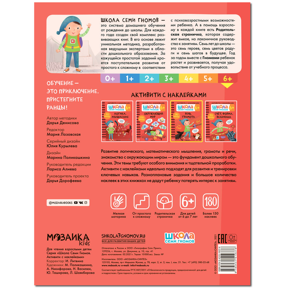 Книга "Речь, грамота 6+" из серии "Школа Семи Гномов. Активити с наклейками" предназначена для развития и тренировки грамотной речи у детей от 6 до 7 лет.