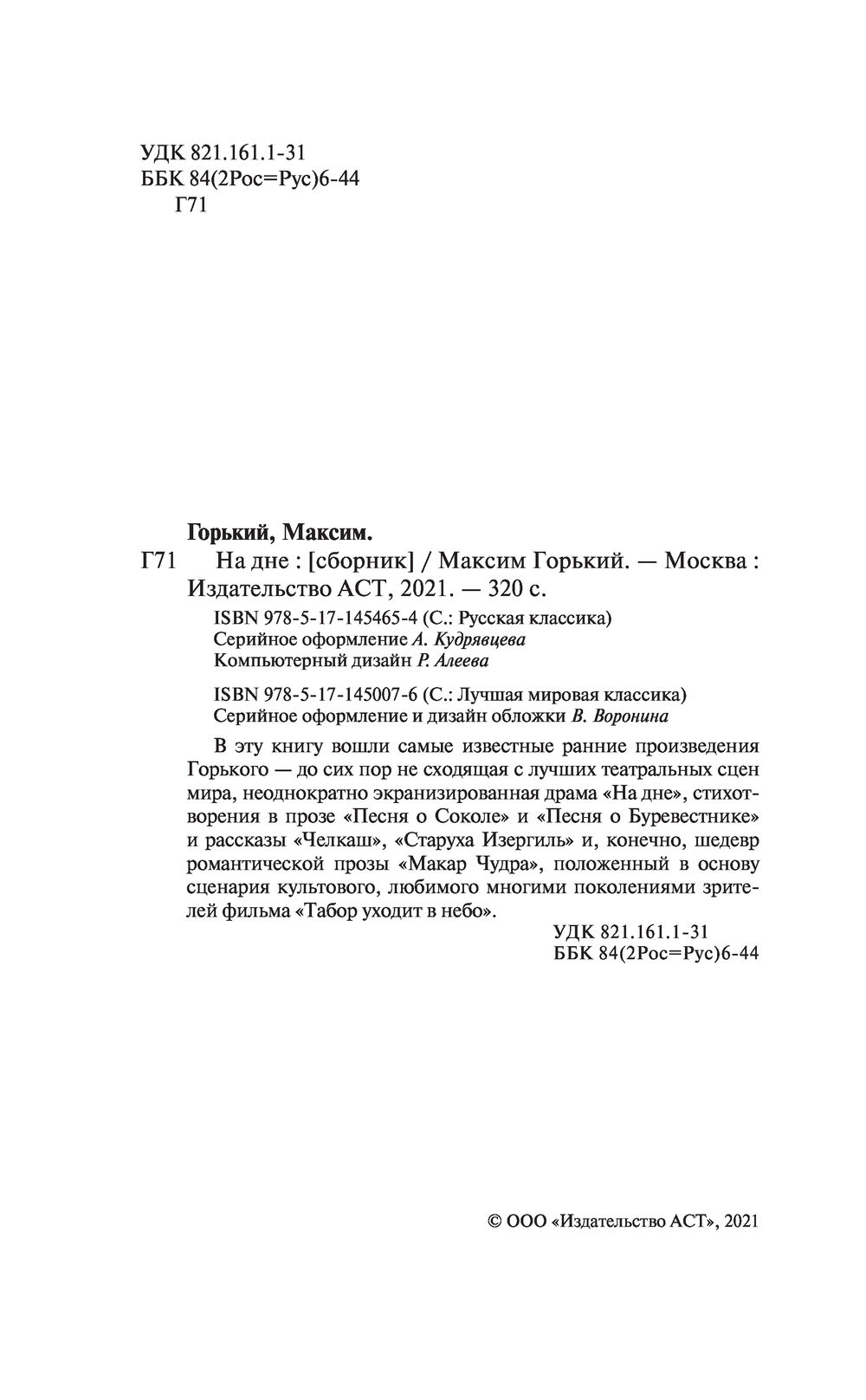 В эту книгу вошли самые известные ранние произведения Горького – до сих пор не сходящая с лучших театральных сцен мира, неоднократно экранизированная драма "На дне", стихотворения в прозе "Песня о Соколе" и "Песня о Буревестнике" и рассказы "Челкаш", "Старуха Изергиль" и, конечно, шедевр романтической прозы "Макар Чудра", положенный в основу сценария культового, любимого многими поколениями зрителей фильма "Табор уходит в небо".