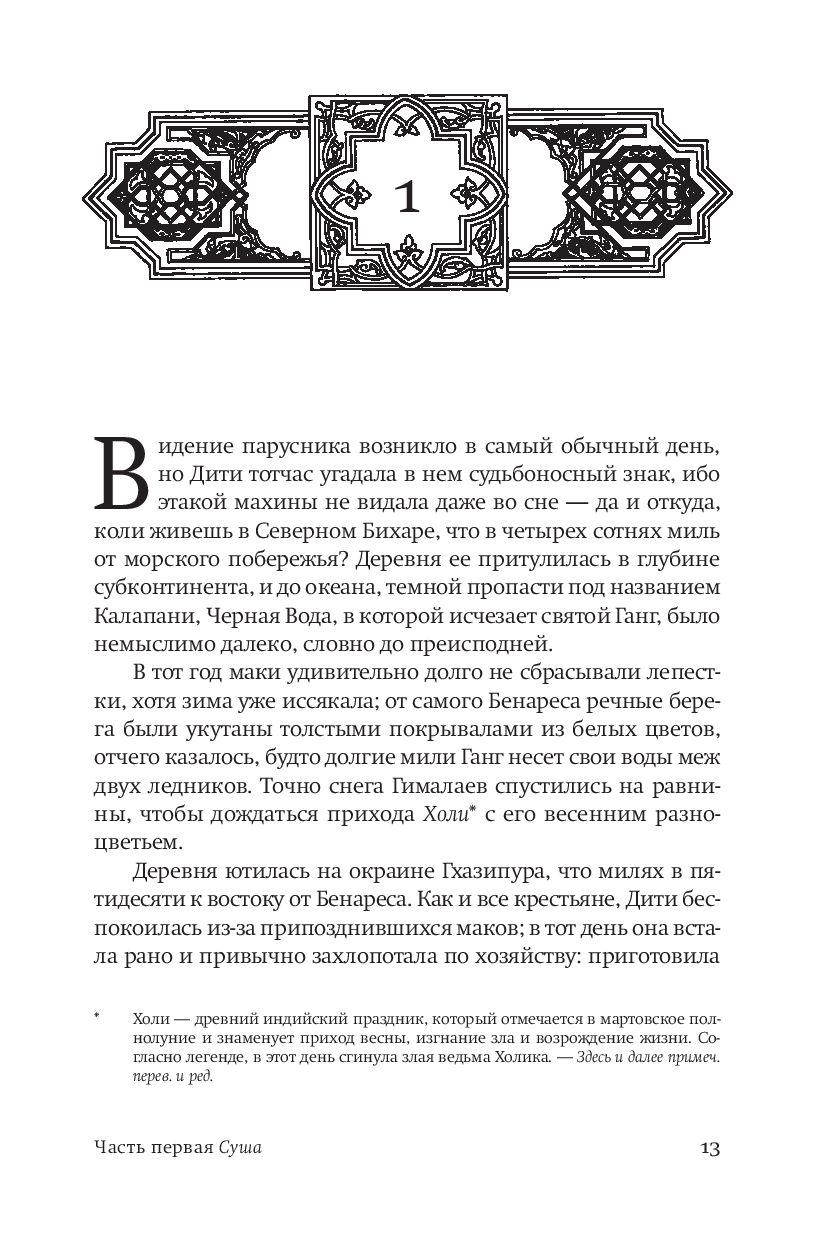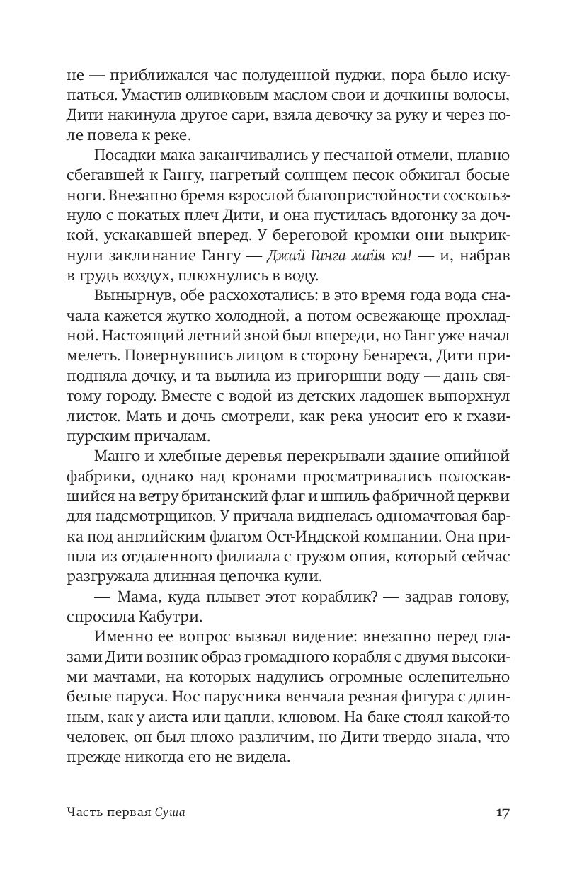 Первый том эпической саги-трилогии, в центре которой сплетение историй самых разных людей. Всех их судьба сведет на шхуне "Ибис", на которой они отправятся в неведомую жизнь.