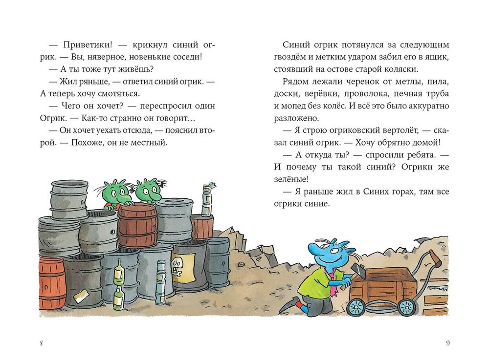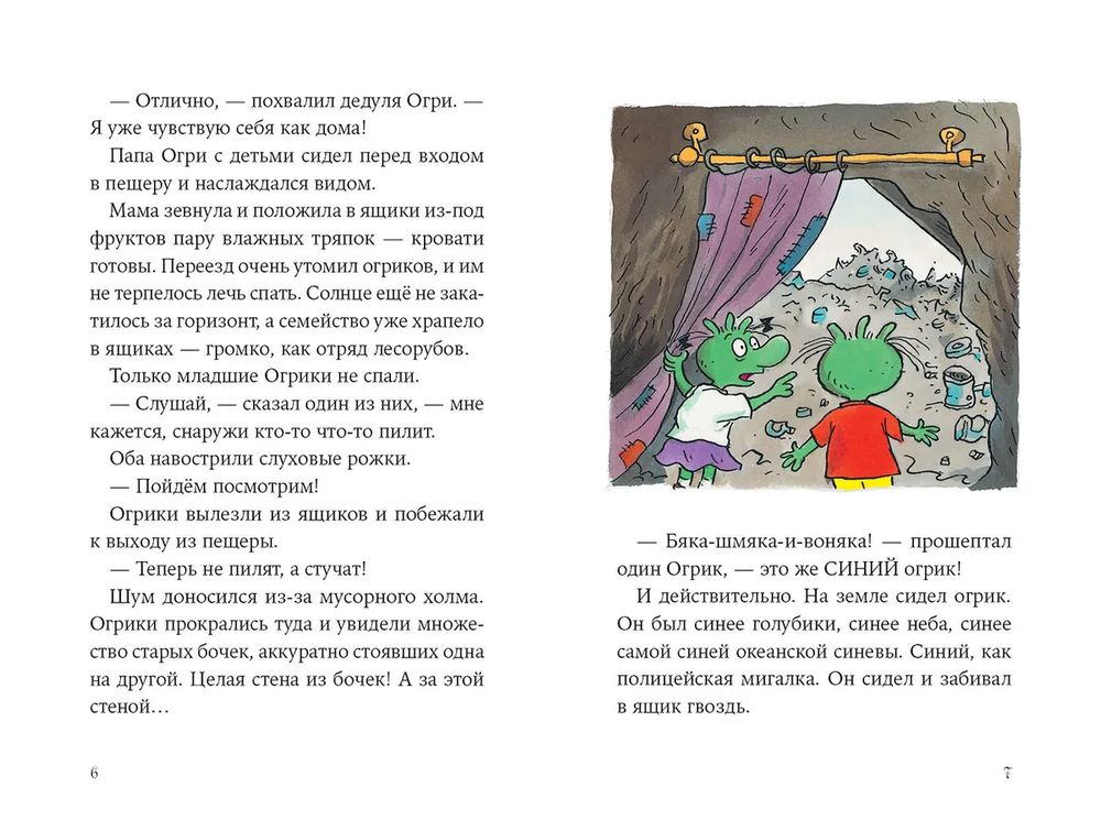 Помогать нужно всем, даже тем, кто на тебя не похож. Огрики убедились в этом лично, когда познакомились с новым соседом – синим огриком. Как известно, зеленые огрики обожают хулиганить, шалить и устраивать вокруг беспорядок. Их родственники с Синих гор оказались совсем другие. Даже мусор они раскладывают по полочкам и лужи ровняют по линеечкам. Ужиться с таким соседом было очень непросто. Но однажды синий попал в беду, и огрики не смогли бросить его на произвол судьбы.