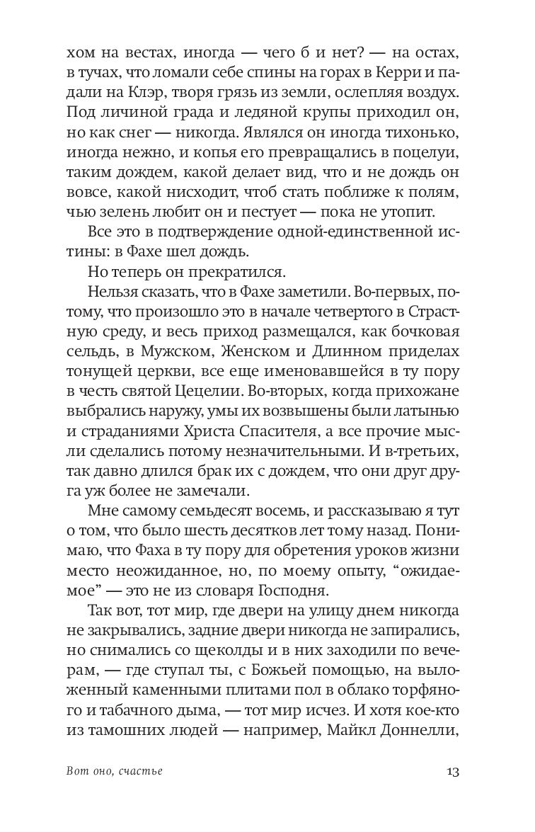 1957 год. В деревеньке Фаха в графстве Клэр, где ничто не менялось тысячу лет, грядут перемены. Во-первых, прекратился дождь. Никто не помнит, когда он начался: вечный дождь на западном побережье Ирландии – норма жизни. Но вот местный священник Отец Коффи возвещает приход электричества, и тучи, кажется, рассеиваются.