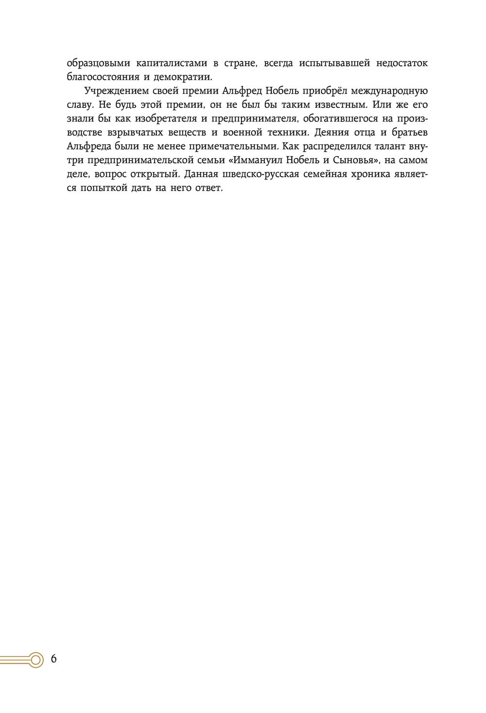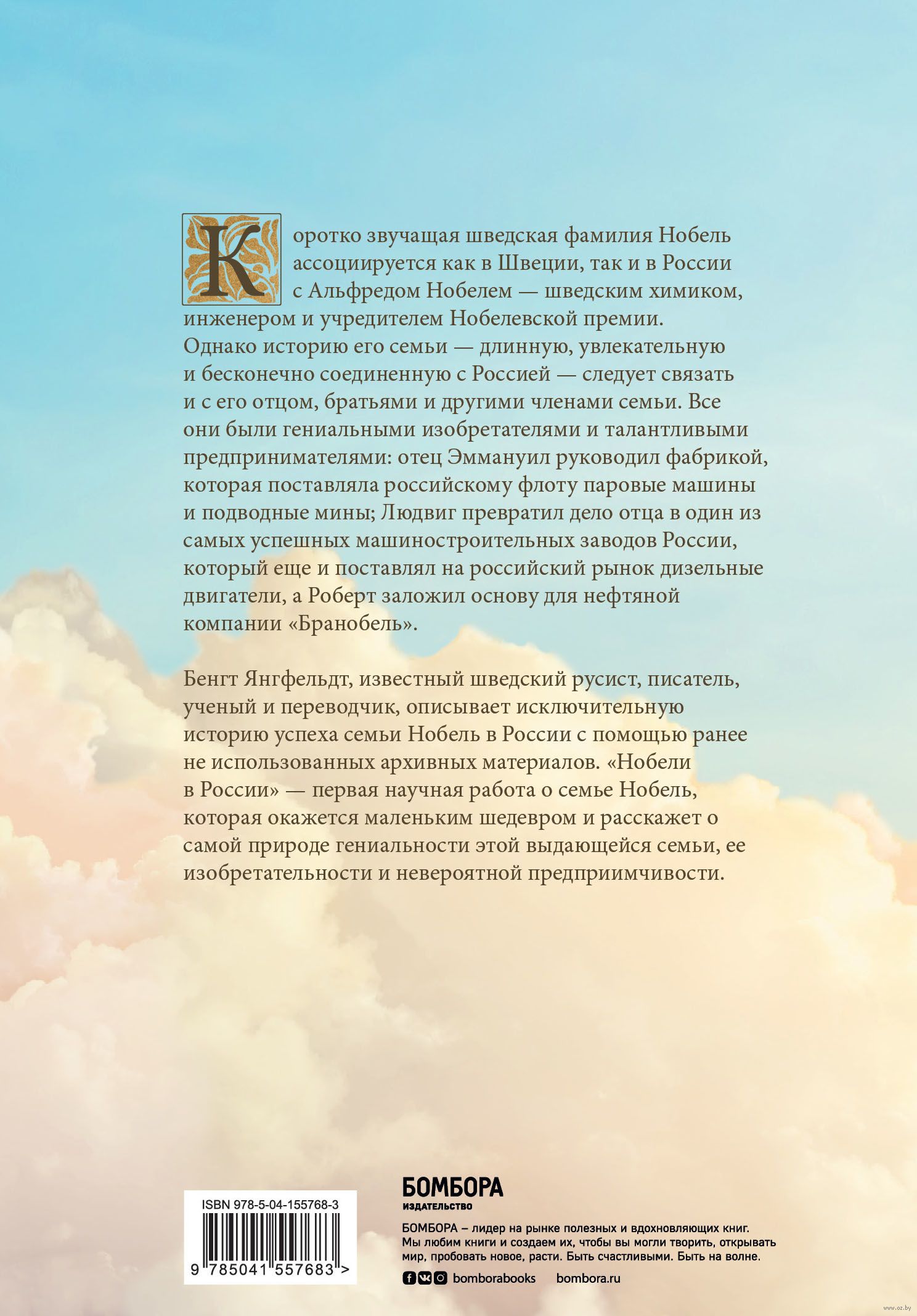 Все они были гениальными изобретателями и талантливыми предпринимателями: отец Иммануил руководил фабрикой, которая поставляла российскому флоту паровые машины и подводные мины; Людвиг превратил дело отца в один из самых успешных машиностроительных заводов России, который еще и поставлял на российский рынок дизельные двигатели, а Роберт заложил основу для нефтяной компании "Бранобель". Бенгт Янгфельдт, известный шведский русист, писатель, ученый и переводчик, описывает исключительную историю успеха семьи Нобель в России с помощью ранее не использованных архивных материалов.