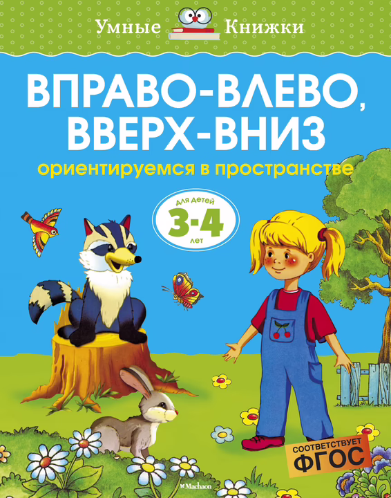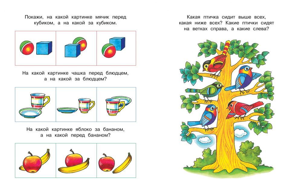 Занимаясь по этой книжке, малыши 3-4 лет смогут закрепить навыки ориентирования в пространстве, освоить такие пространственные понятия, как "направо", "налево", "справа", "слева", "выше", "ниже", "внутри", "снаружи", "далеко", "близко", а также потренироваться в правильном употреблении предлогов "в", "на", "над", "под", "около", "перед" и так далее.