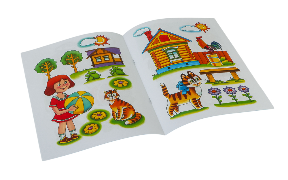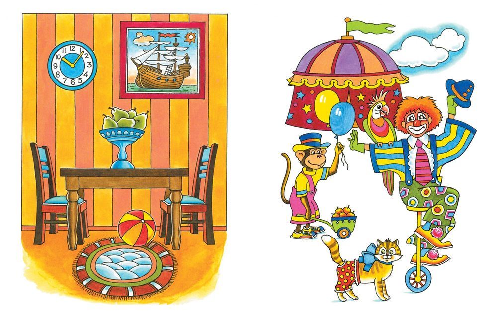 Книжка состоит из сюжетных картинок, которые нужно сравнить между собой. Попросите малыша назвать отличия между схожими картинками. Если он не назовет их с первого раза, покажите ему картинки еще раз.