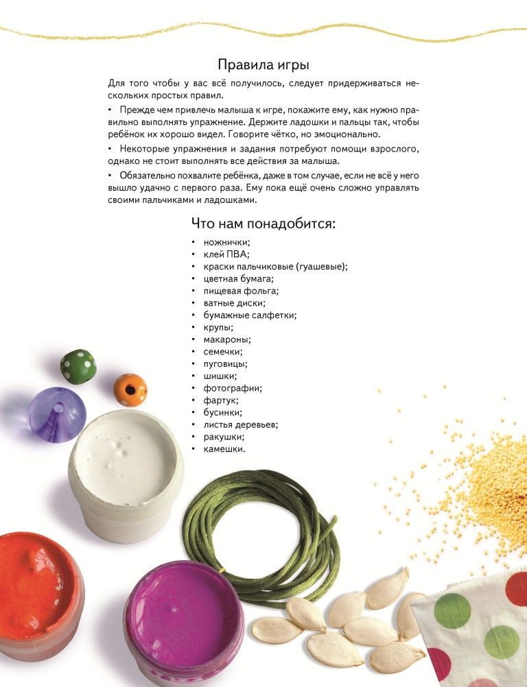 В издании собраны забавные сказки, стихи, пальчиковые игры, а также множество других увлекательных заданий, которые обязательно заинтересуют ребёнка, вызовут у него массу положительных эмоций и поднимут настроение. В книге предусмотрены странички с контурными картинками – на них кроха сможет выкладывать из зёрнышек симпатичных зверюшек, тренируя свои маленькие пальчики.