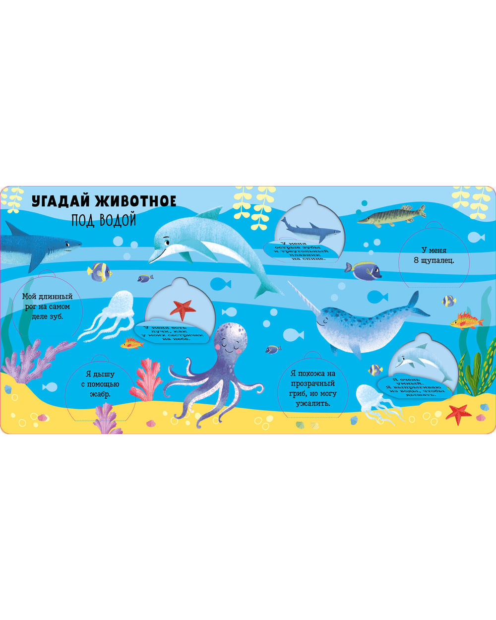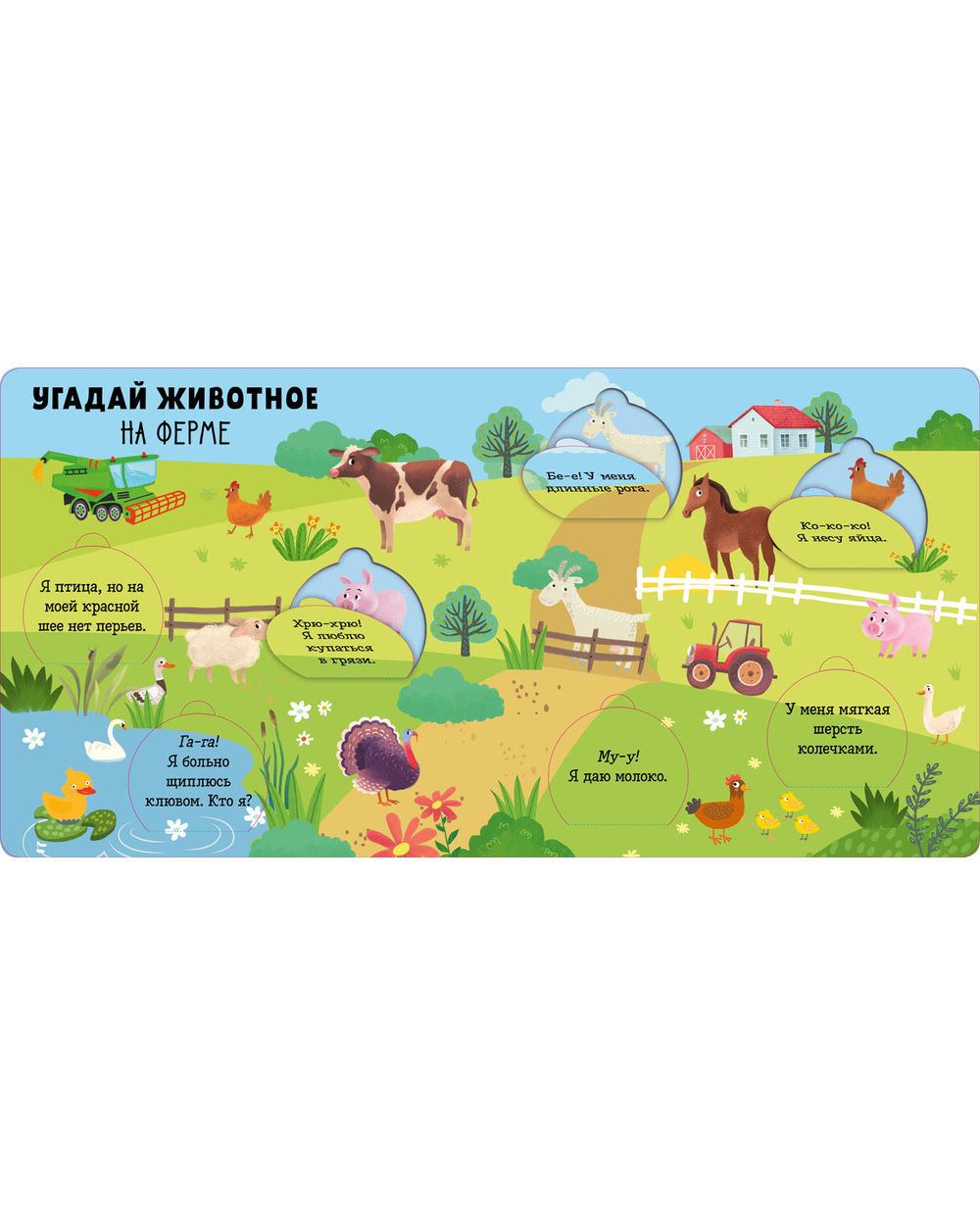 Из книжки "Угадай животное" малыш узнает названия 35 животных и интересные факты о них. В ней 35 окошек с любопытными вопросами, под каждым из которых ждет сюрприз! А любой из 5 разворотов – это отличная возможность поиграть в "найди и покажи" и потренировать внимание, логику и воображение, память и мелкую моторику.