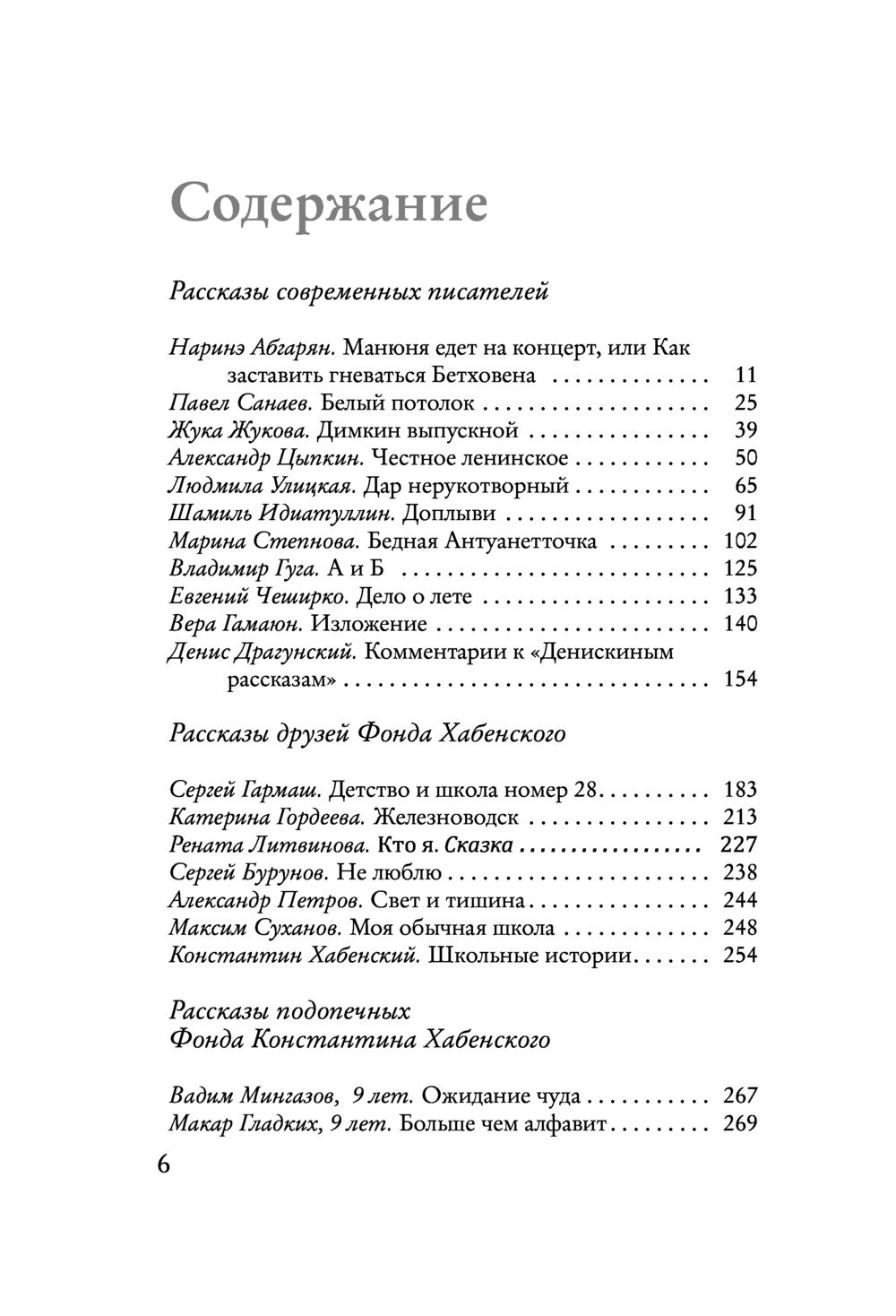 В книгу вошли истории о школьных годах друзей Фонда Хабенского – таких артистов, как Сергей Бурунов, Сергей Гармаш, Рената Литвинова, Александр Петров, Максим Суханов, Константин Хабенский, а также рассказы современных писателей, среди которых: Людмила Улицкая, Марина Степнова, Наринэ Абгарян, Катерина Гордеева, Жука Жукова, Денис Драгунский, Шамиль Идиатуллин, Павел Санаев, Александр Цыпкин, Евгений Чеширко. Завершит книгу подборка рассказов, написанных подопечными Фонда Хабенского.