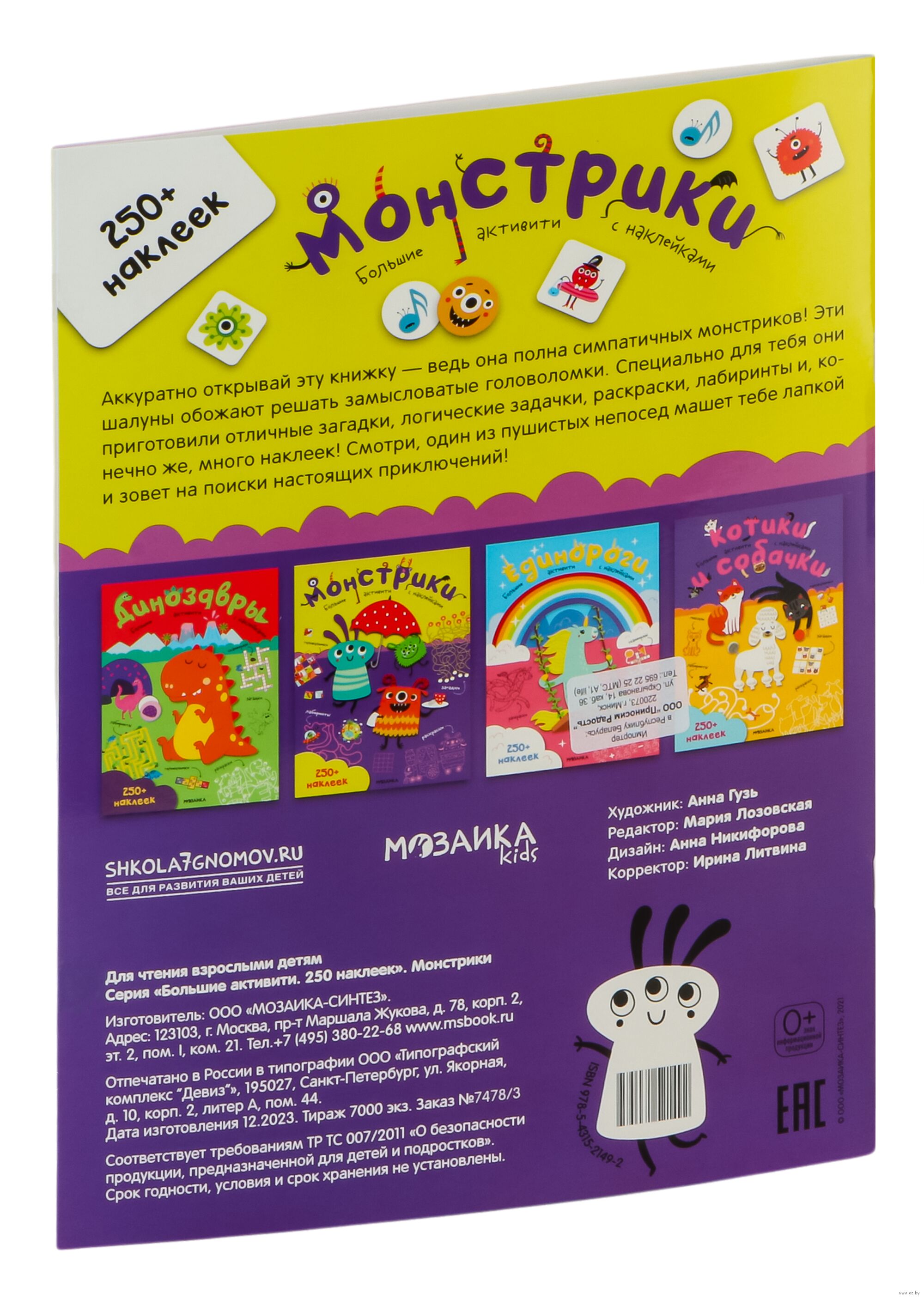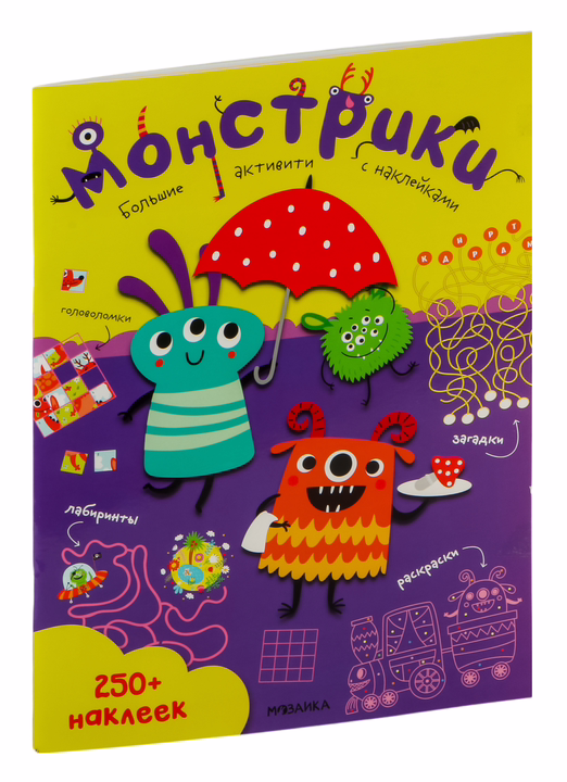 Книга "Монстрики" из серии "Большие активити. 250 наклеек" - настоящая находка. Тут есть все, что так обожают дети. Много-много наклеек: больше 250. Самые любимые герои - монстрики. И конечно, веселые развивающие задания.