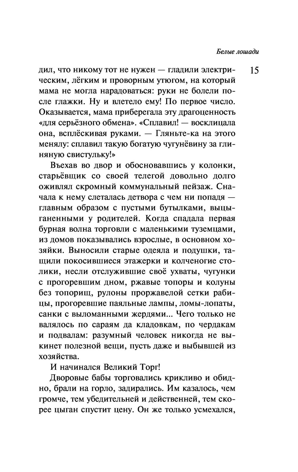 Вторая книга романа "Наполеонов обоз" – "Белые лошади" – затягивает читателя в воронку любви и предательства, счастья и горя двух главных героев – Аристарха и Надежды. За короткий срок на них обрушивается груз сильнейших потрясений, которые не часто и не всем выпадают в юности. Сильные, цельные натуры, оба они живут на такой высоте чувств, которая ничего не прощает. Судьба буквально расшвыривает в разные стороны двух влюблённых. Каждый из них теперь идет своим отдельным путем, оставаясь навсегда глубоко одиноким, раненым душевно.