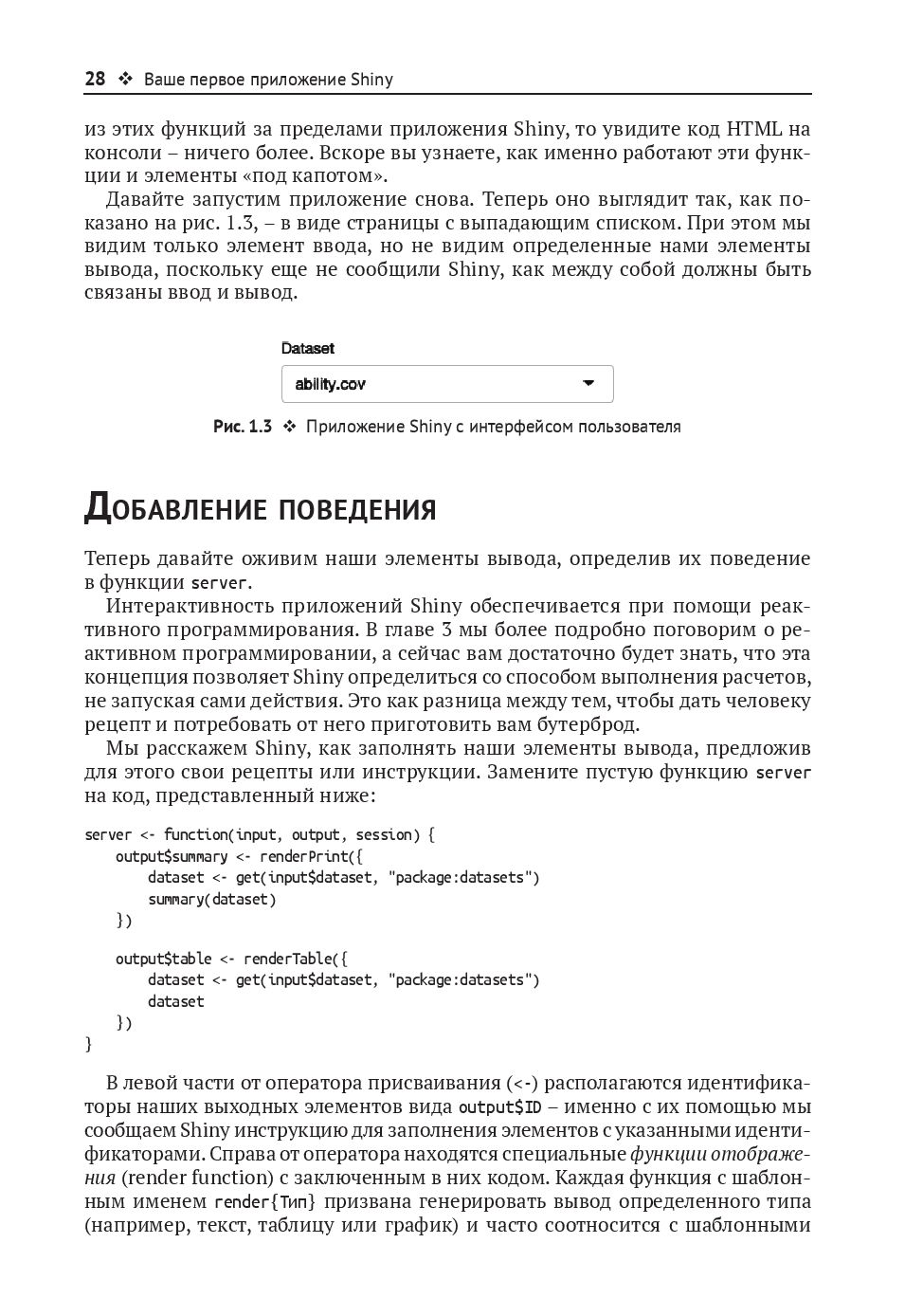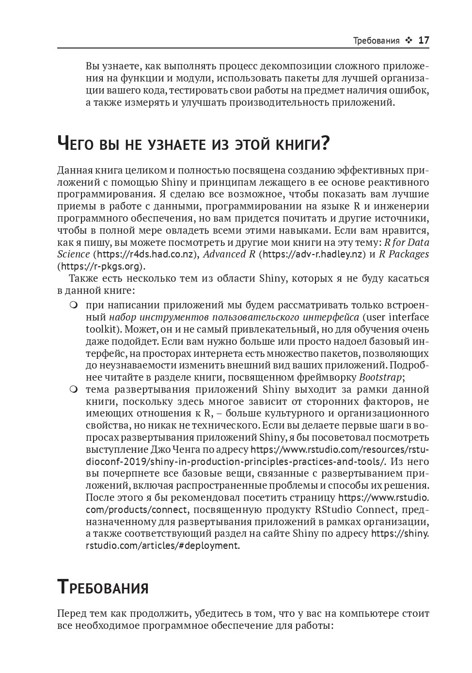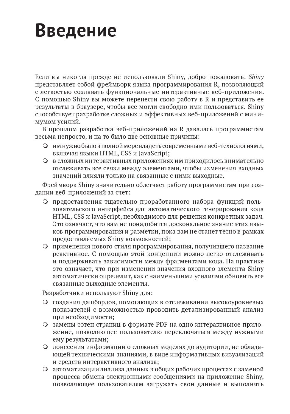 Хэдли Уикхэм из RStudio покажет аналитикам данных, статистикам и научным исследователям, не обладающим глубокими познаниями в области HTML, CSS и JavaScript, как создавать мощные веб-приложения на языке R. Книга, которую вы держите в руках, является полноценным руководством по фреймворку Shiny, который поможет вам из новичка в этой области стать настоящим экспертом и писать масштабные, сложные и эффективные приложения.