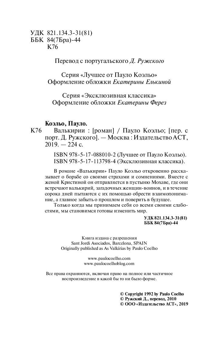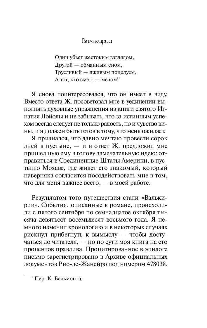 В романе "Валькирии" Пауло Коэльо откровенно рассказывает о борьбе со своими страхами и сомнениями. Вместе с женой Кристиной он отправляется в пустыню Мохаве, где они встречают валькирий, загадочных женщин-воинов, и в течение сорока дней пытаются с их помощью обрести взаимопонимание, а главное забыть о прошлом и поверить в будущее.