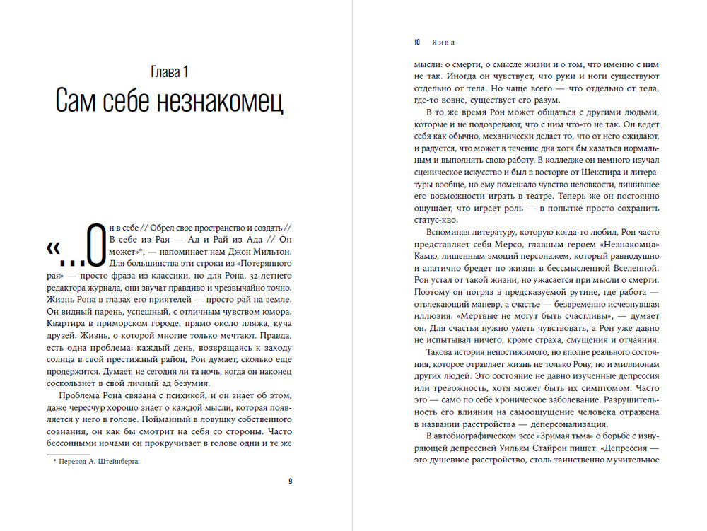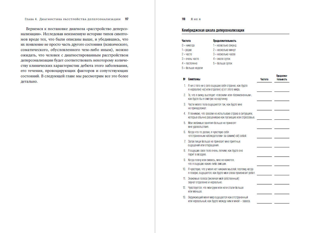 Некоторые люди чувствуют себя оторванными от своего "я", а мир вокруг кажется им нереальным, словно их жизнь происходит с кем-то другим. Это состояние называется деперсонализацией, оно малоизучено и трудно диагностируется. Известно, что его может вызвать пережитая травма или сильный стресс. В книге американского психиатра Дафни Симеон и австралийского журналиста Джеффри Абугела, много лет живущего с деперсонализацией, впервые опубликованной на русском языке, подробно описаны клинические признаки, история исследований, теории патогенеза и методы терапии деперсонализационного расстройства. Работа авторов основана на знаниях, накопленных Школой медицины Маунт-Синай и британским Институтом психиатрии при Кембриджском университете, и будет интересна специалистам в области психического здоровья и людям с деперсонализацией, которые пытаются понять, что с ними происходит, и найти путь к выздоровлению.