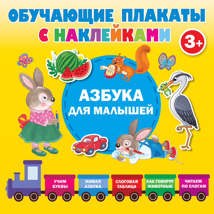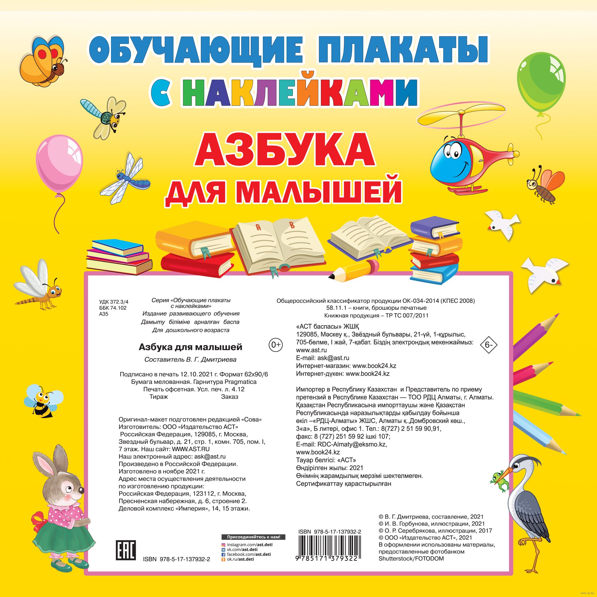 "Азбука с наклейками для малышей" – плакат раннего обучения в картинках. Замечательная перекидная книжка – отличное украшение детской комнаты и самый "ненавязчивый" способ обучения двухлетнего крохи. Развивающее пособие большого формата познакомит малышей с азбукой, цифрами от 1 до 5, цветами и геометрическими формами, без запинки будут называть времена года. Ребята с удовольствием назовут членов семьи, запомнят названия растений, фруктов и овощей, игрушек, предметов посуды и одежды, обитателей зоопарка, домашних и лесных животных.