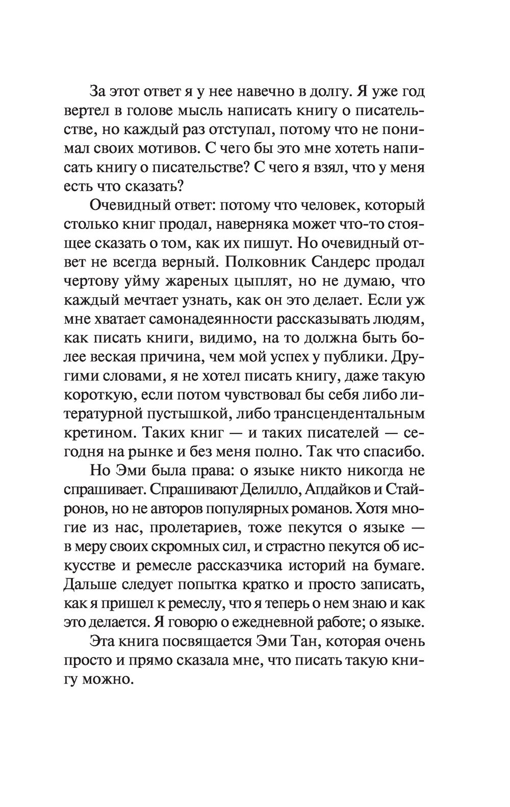 Это, пожалуй, самая необычная из книг Стивена Кинга. Книга, в которой автобиографические, мемуарные мотивы соседствуют не только с размышлениями о писательском искусстве вообще, но и с самыми настоящими "профессиональными советами тем, кто хочет писать как Стивен Кинг".