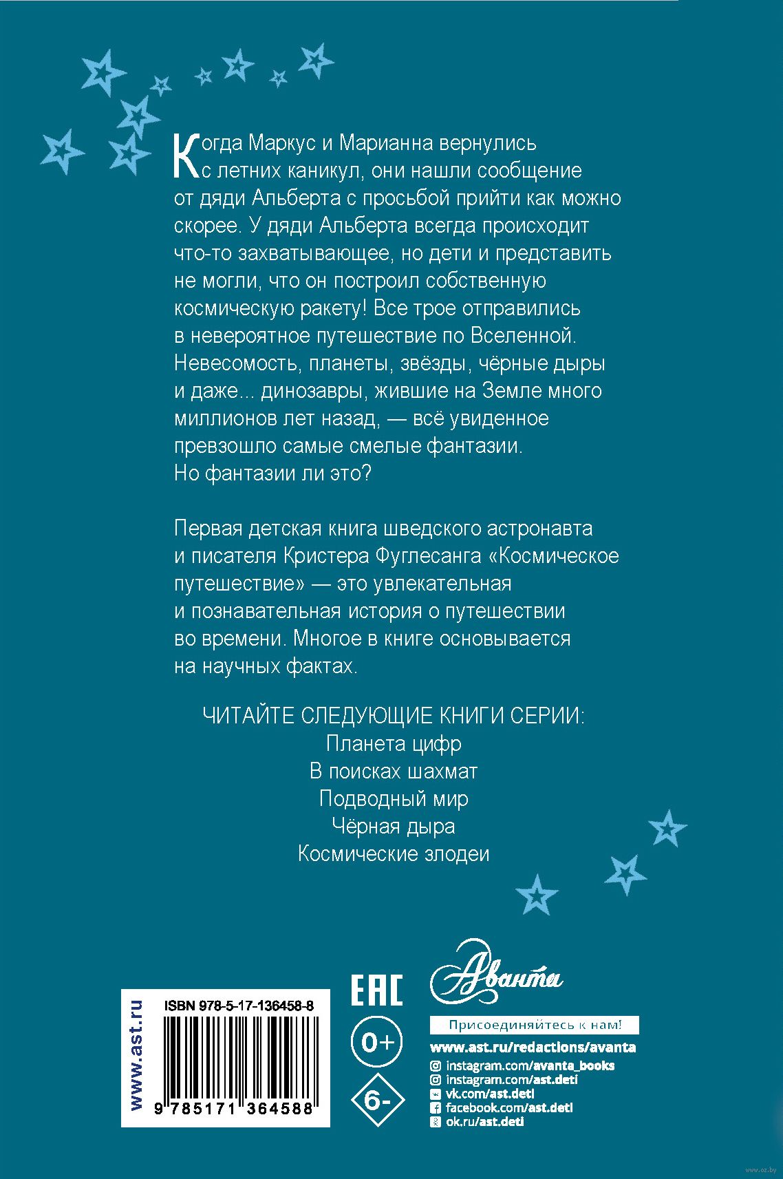Книга шведского астронавта и писателя Кристера Фуглесанга "Космические путешествия" – первая из шести увлекательнейших сказок о приключениях учёного дяди Альберта и детей – Маркуса и Марианны. Герои этой книги совершат удивительное и познавательное путешествие по Вселенной, познакомятся с планетами, звёздами и чёрными дырами и даже... окажутся на Земле во время динозавров! Многое в этой истории основано на реальных фактах, о которых автор расскажет в конце книги.