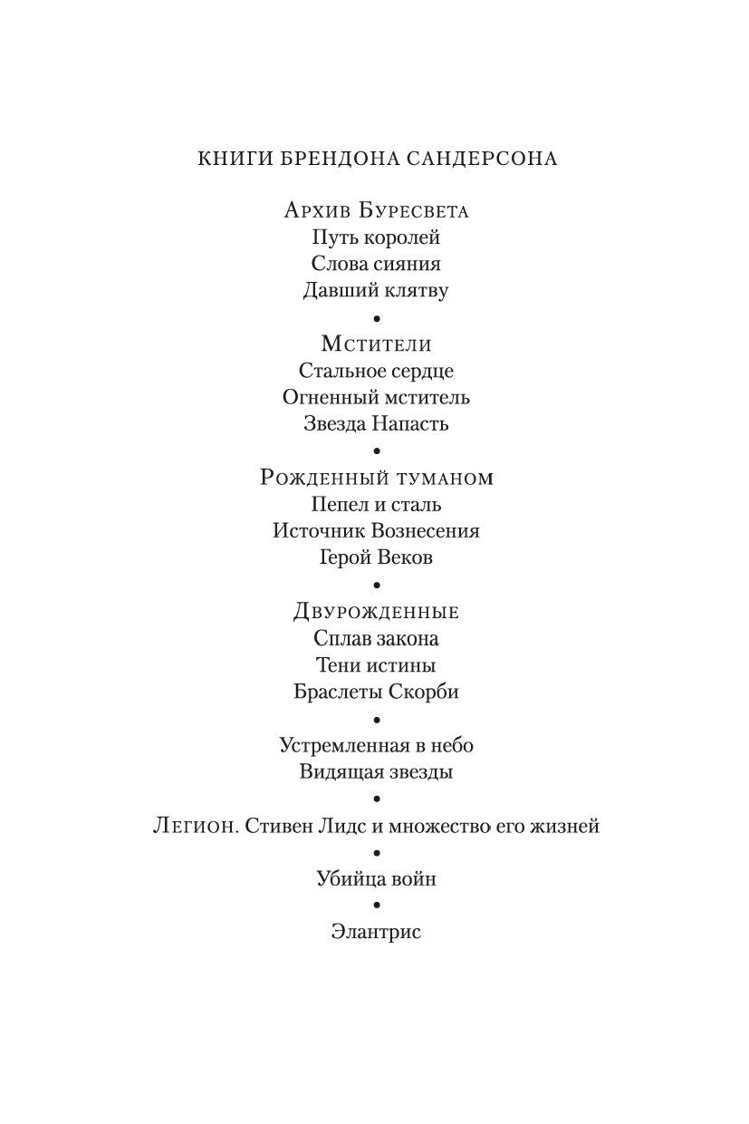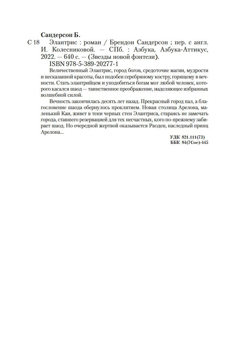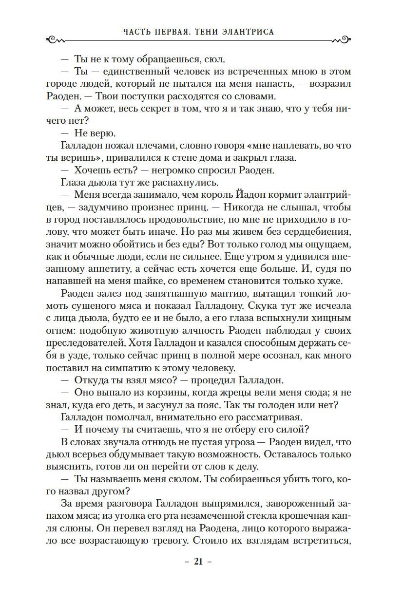 Вечность закончилась десять лет назад. Прекрасный город пал, а благословение шаода обернулось проклятием. Новая столица Арелона, маленький Каи, живет в тени черных стен Элантриса, стараясь не замечать города, ставшего резервацией для тех несчастных, кого по-прежнему забирает шаод. Но очередной жертвой оказывается Раоден, наследный принц Арелона...