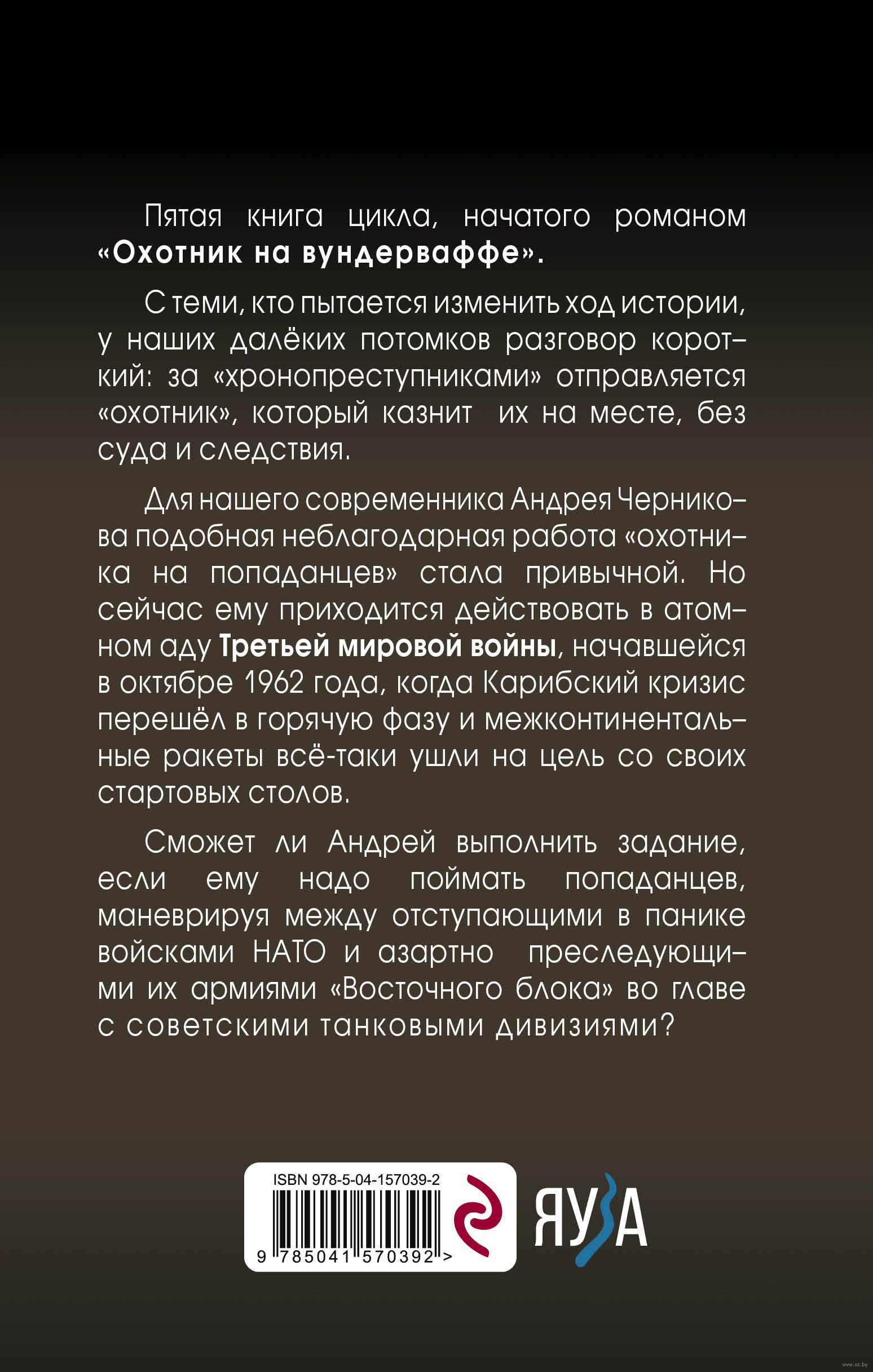 С теми, кто пытается изменить ход истории у наших далёких потомков разговор короткий: за "хронопреступниками" отправляется "охотник", который казнит их на месте, без суда и следствия. Для нашего современника Андрея Черников подобная неблагодарная работа "охотника на попаданцев" стала привычной. Но сейчас ему приходится действовать в атомном аду Третьей Мировой войны, начавшейся в октябре 1962-го года, когда "Карибский Кризис" перешел в горячую фазу и межконтинентальные ракеты всё-таки ушли на цель со своих стартовых столов. Сможет ли Андрей выполнить задание, если ему надо поймать попаданцев, маневрируя между отступающими в панике войсками НАТО и азартно преследующими их армиями "Восточного блока" во главе с советскими танковыми дивизиями?