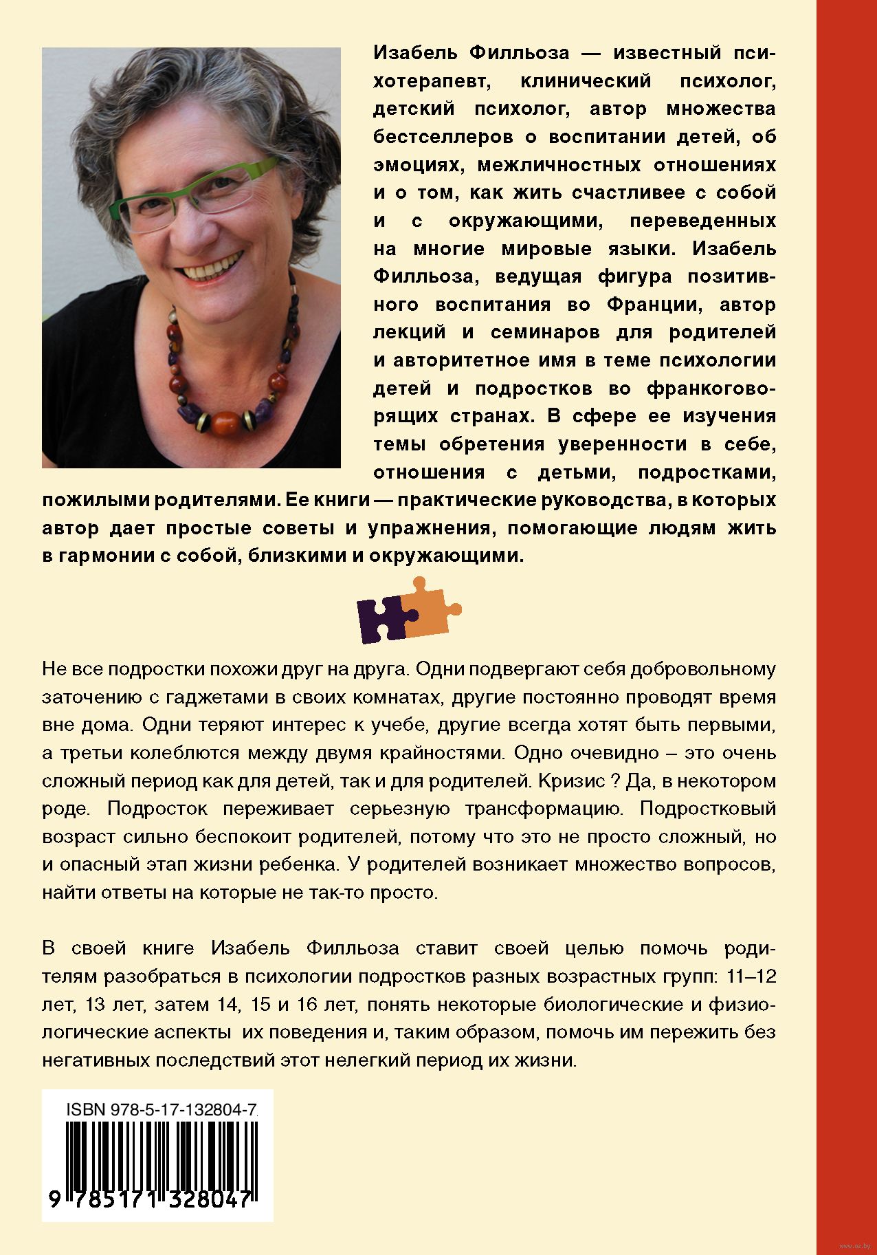 В своей книге известный психотерапевт и клинический психолог Изабель Филльоза поможет родителям разобраться в психологии подростков разных возрастных групп: 11-12 лет, 13 лет, затем 14, 15 и 16 лет, понять некоторые биологические и физиологические аспекты их поведения.