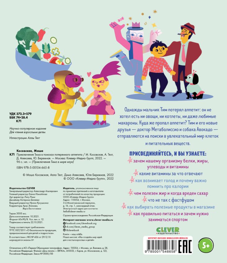 Однажды мальчик Тим потерял аппетит: он не хотел есть ни овощи, ни котлеты, ни даже любимые макароны. Куда же пропал аппетит? Тим и его новые друзья – доктор Метаболиссио и пес Авокадо – отправляются на поиски в увлекательный мир клеток и питательных веществ.