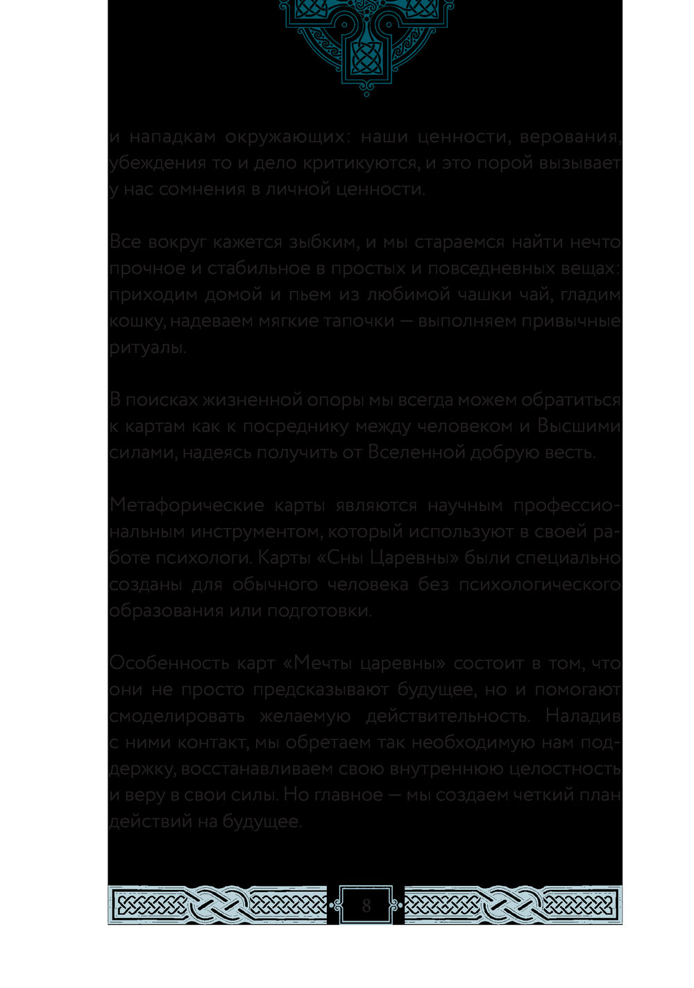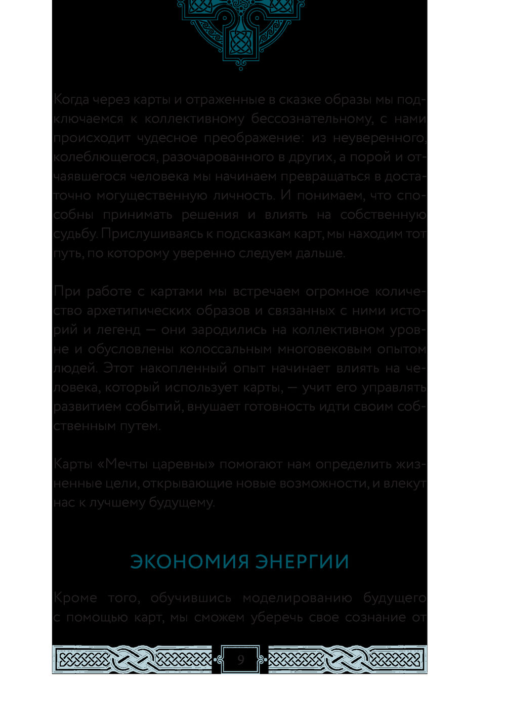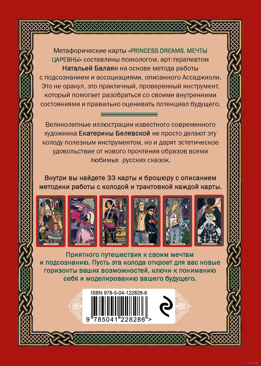 Метафорические карты "PRINCESS DREAMS. МЕЧТЫ ЦАРЕВНЫ" составлены психологом Натальей Балаян на основе метода работы с подсознанием и ассоциациями, описанным Ассаджиоли. Это не оракул, это практичный проверенный инструмент, который помогает разобраться со своими внутренними состояниями и правильно оценивать потенциал будущего. Великолепные иллюстрации известного современного художника Екатерины Белявской делают эту колоду не просто полезным инструментом, но и дарят эстетическое удовольствие от нового прочтения образов всеми любимых русских сказок. Внутри вы найдете 33 карты и брошюру с описанием методики работы с колодой и трактовки каждой карты. Приятного путешествия к своим мечтам и подсознанию. Пусть эта колода откроет для вас новые горизонты ваших возможностей, ключи к пониманию себя и моделированию вашего будущего.
