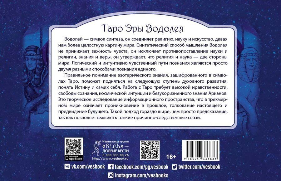 "Таро Эры Водолея" позволит лучше понять себя, прояснить актуальные вопросы о здоровье, любви, карьере и многом другом. Откройтесь влиянию Водолея, и он станет вашим проводником в мир скрытых явлений и тайн, разбудит вашу интуицию и дарует способность слышать послания Вселенной.