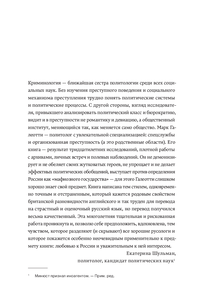 Галеотти рассказывает о рождении и смерти старых "понятий", объясняет, в чем ключевые отличия владивостокских ОПГ от санкт-петербургских, а также показывает, как работает неумолимая логика преступного мира.