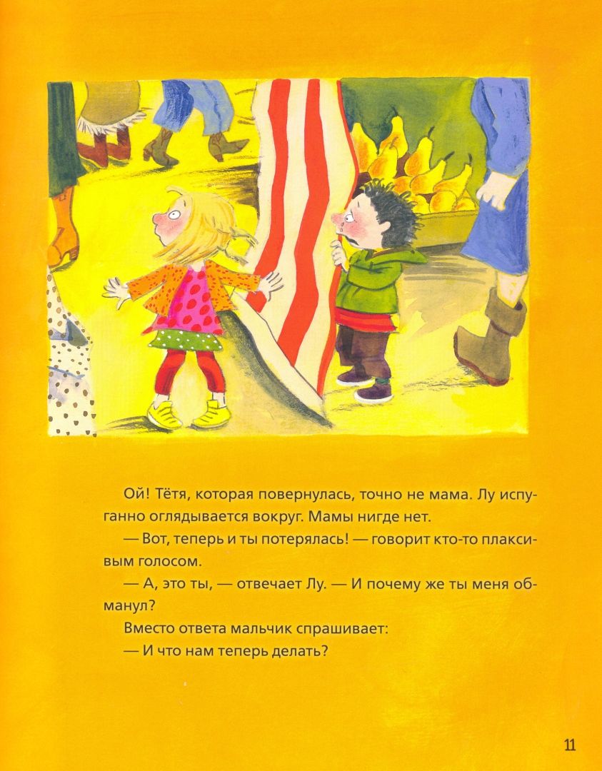 Лу и мама идут на рынок. Они хотят купить хлеб и бананы. На рынке сегодня настоящее столпотворение. "Надеюсь, ты не потеряешься здесь", – говорит мама. В толпе очень тесно. Лу видит только ноги. К счастью, у мамы красный плащ. Он такой яркий, что не упустишь из виду. Лу тянет за плащ. Ой! Тётя, которая повернулась, точно не мама. Лу испуганно оглядывается вокруг. Мамы нигде нет.
