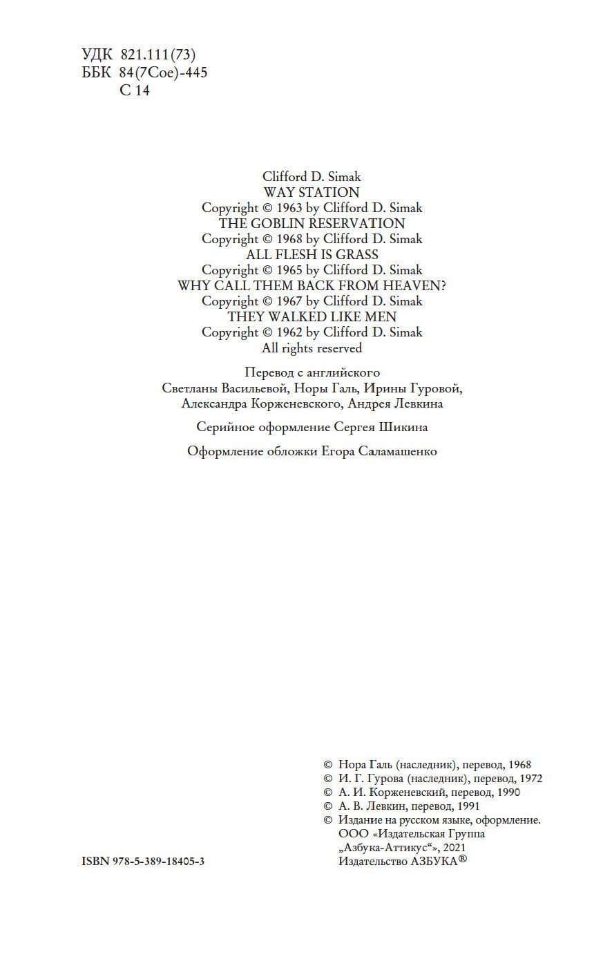 | Название в оригинале | Way Station+The Goblin Reservation+All Flesh is Grass+Why Call Them Back from Heaven+They Walked Like Men |